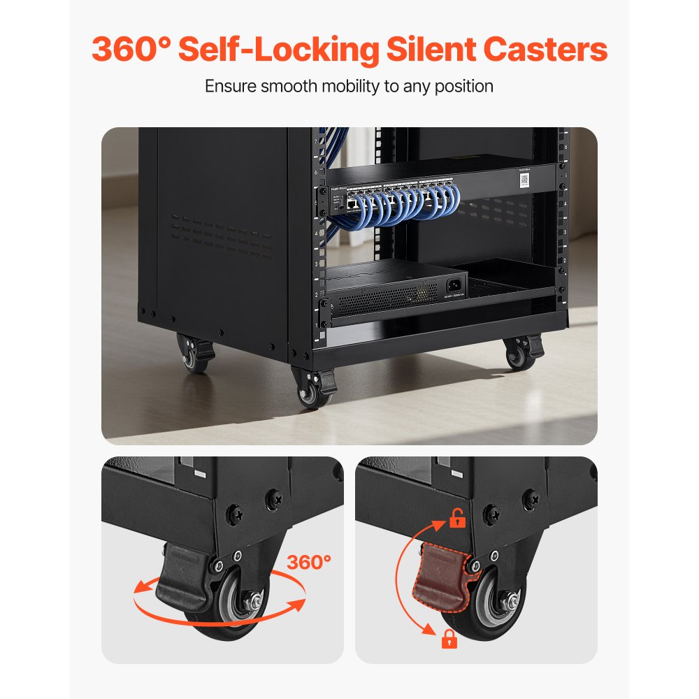 Przyjazna dla użytkownika konstrukcja: Ta obudowa rack 16U posiada górną półkę, która zapewnia dodatkową przestrzeń do przechowywania, zapewniając więcej miejsca na uporządkowanie sprzętu. Wyposażona w blokowane kółka, można ją łatwo i bezpiecznie przesuwać w razie potrzeby.