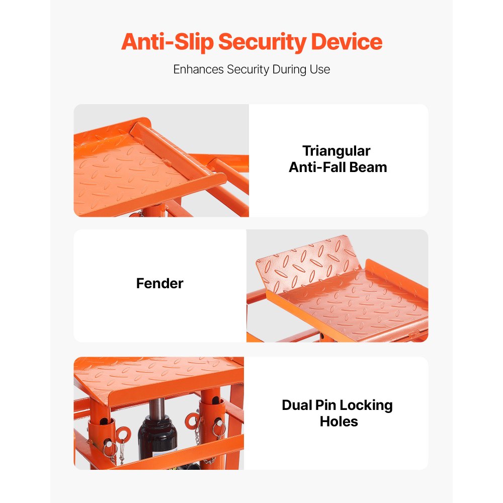 System antypoślizgowy: Nasze rampy do wymiany oleju posiadają antypoślizgową powierzchnię, co zapewnia lepsze tarcie. Trójkątny wspornik i boczny błotnik utrzymują pojazdy bezpiecznie na miejscu. Dwa otwory blokujące zapewniają stabilność na odpowiedniej wysokości, gwarantując bezpieczne użytkowanie.
