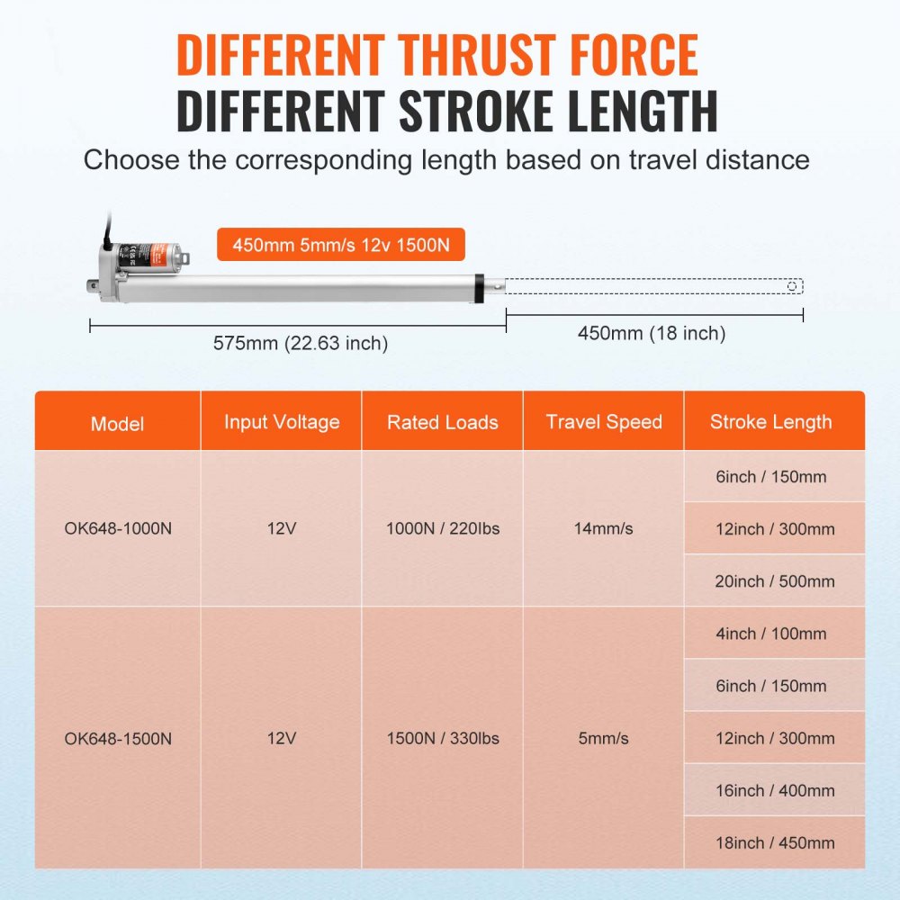 Siłownik liniowy VEVOR 1500N, DC 12 V, napęd liniowy, IP54, elektryczny silnik liniowy, długość skoku 450 mm, poziom hałasu ≤60 dB, elektryczny otwieracz drzwi, prędkość przesuwu 5 mm/s, technologia liniowa, napęd regulowany - Auto-moto | Galaxy Sklep