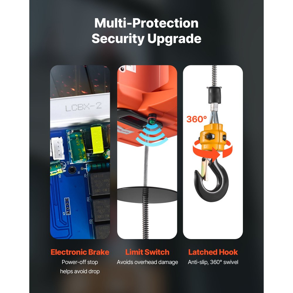 Wielostopniowe zabezpieczenie: Ta elektryczna wciągarka łączy w sobie hamulce elektroniczne i mechaniczne, zapewniając bezpieczne zatrzymanie. Wyłącznik krańcowy i hak bezpieczeństwa 360° zwiększają bezpieczeństwo, a silnik zatrzymuje się automatycznie w przypadku awarii zasilania lub osiągnięcia górnej granicy, zapobiegając upadkowi.