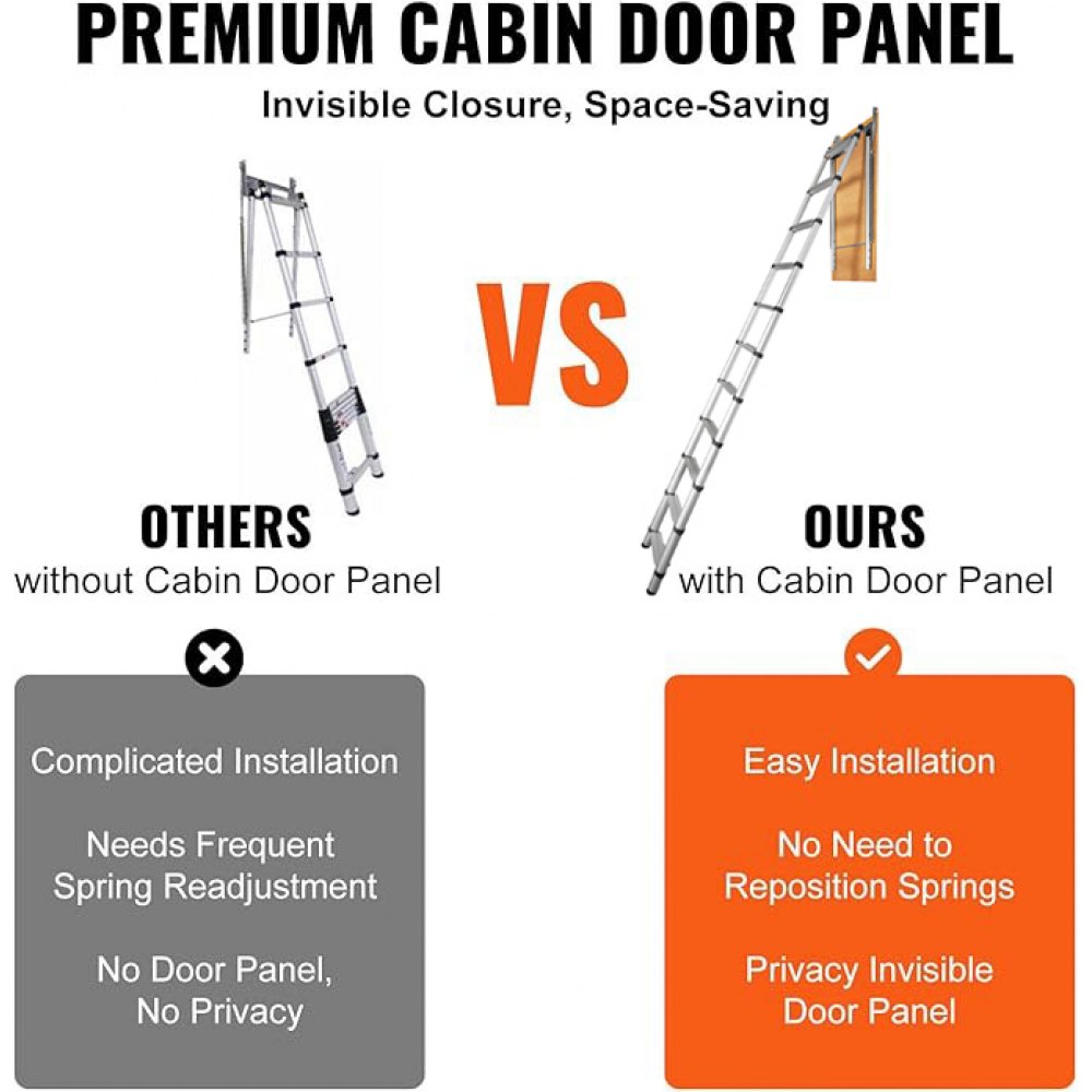 Ukryte drzwi: Ta drabina rozkładana posiada panel drzwi kabinowych, co eliminuje konieczność ponownego mocowania sprężyn podczas montażu, co zwiększa wygodę użytkowania. Po złożeniu drabina automatycznie się zamyka, stając się ukrytymi drzwiami strychowymi, zapewniając prywatność na strychu przez cały czas.