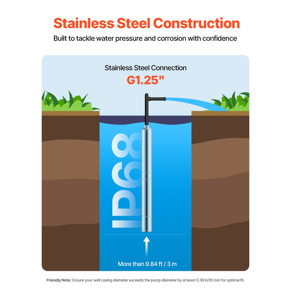 Idealna do każdego źródła wody: Nasza pompa głębinowa jest przeznaczona do szerokiej gamy źródeł wody, dzięki czemu idealnie nadaje się do nawadniania w rolnictwie, pojenia zwierząt gospodarskich, zaopatrzenia w wodę gospodarstw domowych, ujęć rzek i utrzymania stawów. Uwaga: W przypadku nowej studni odwiertowej, umieść warstwę gazy wokół wlotu. Upewnij się, że średnica rury studni przekracza średnicę pompy o co najmniej 10 mm (0,39 cala), aby zapewnić prawidłowe dopasowanie. Nie używaj bez wody lub przy niskim poziomie wody, aby uniknąć oparzeń.