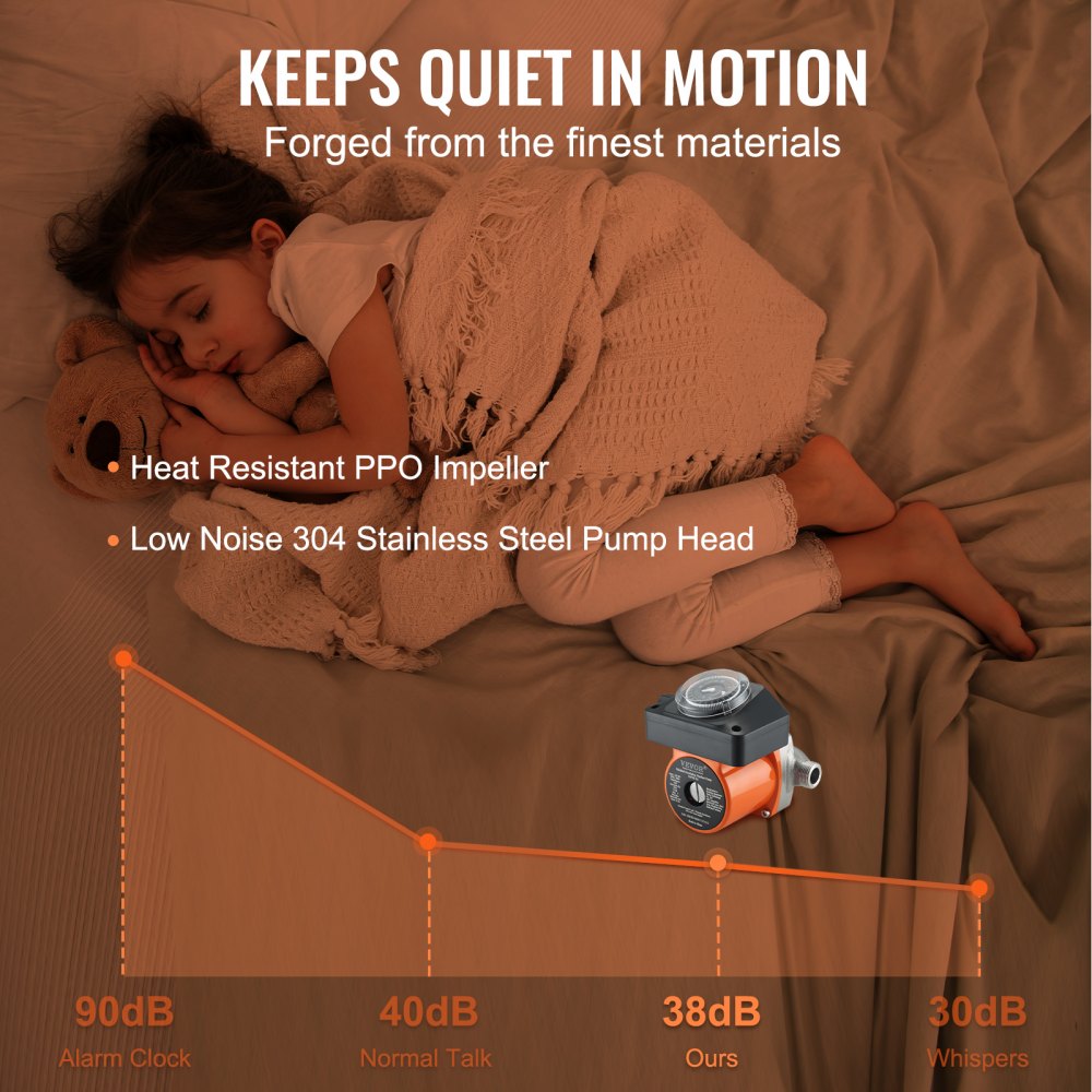 Cichy i wydajny przepływ: Przekonaj się o wydajności naszej pompy obiegowej z maksymalnym przepływem wody 38 l/min, ciśnieniem do 0,6 bara (9,57 PSI) i wysokością tłoczenia do 6,6 m. Ale to nie wszystko! Nasza pompa wyposażona jest również w odporny na wysoką temperaturę wirnik PPO i głowicę pompy ze stali nierdzewnej 304, co zapewnia wyjątkowo cichą i bezstresową cyrkulację ciepłej wody. Poziom hałasu wynoszący zaledwie 3 dB sprawi, że praca pompy będzie niemal niezauważalna!