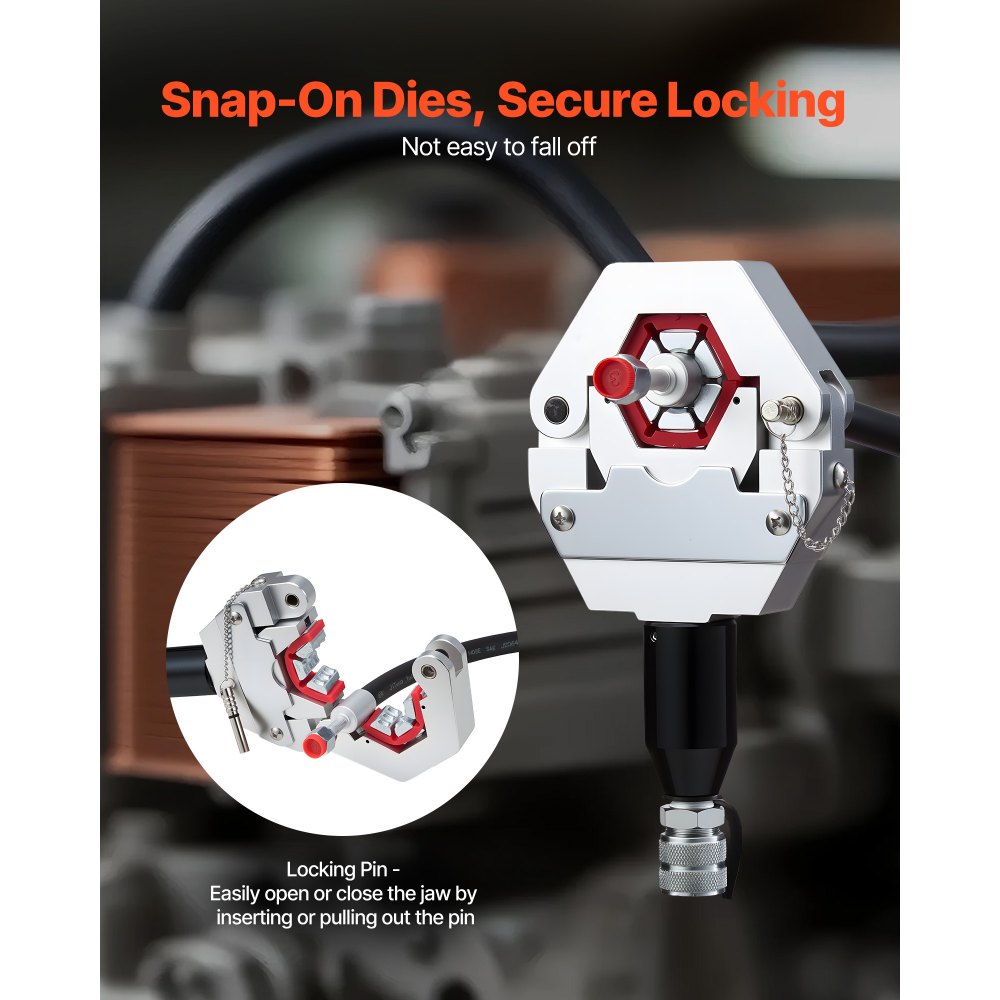 Elastyczność i łatwość obsługi: Mocowana matryca umożliwia szybki montaż bez użycia narzędzi i bezpieczne mocowanie do zaciskarki. Wystarczy przekręcić zawór hydrauliczny i nacisnąć uchwyt, aby uzyskać wysokiej jakości zaciśnięcia przewodów hydraulicznych klimatyzacji.