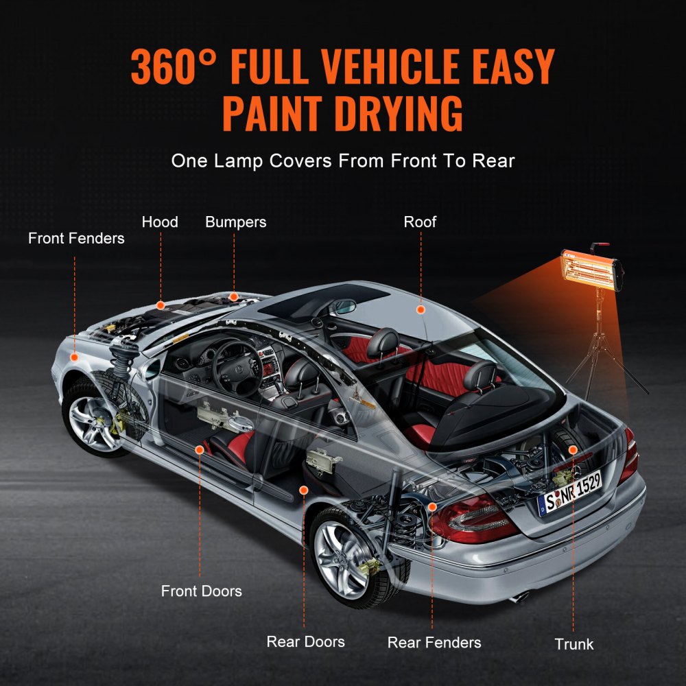 Lampa utwardzająca na podczerwień VEVOR, przenośna/stacjonarna, podwójnego zastosowania, 2000 W, ustawienie czasu 0–90 min, automatyczna lampa utwardzająca z automatycznym nagrzewaniem i uchwytem, 32 m², ogrzewacze kabin lakierniczych/do pieczenia