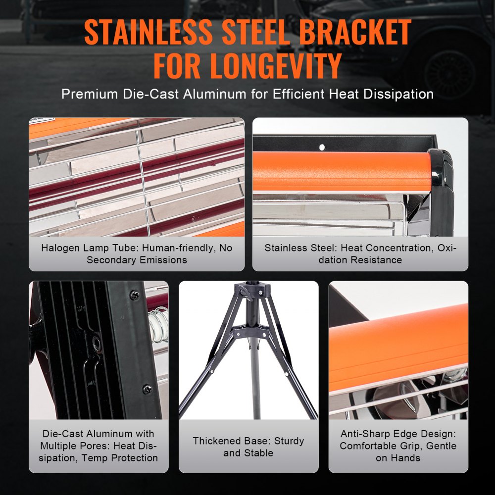 Ochrona bezpieczeństwa: Ze względów bezpieczeństwa oferujemy wysokiej jakości żarówki halogenowe oraz klosz ze stali nierdzewnej z zabezpieczeniem antyoksydacyjnym. Pogrubiona podstawa zapewnia stabilność i zapobiega chwianiu się, a gładkie krawędzie zapewniają komfort i zapobiegają urazom, gwarantując bezproblemowe, długotrwałe użytkowanie.