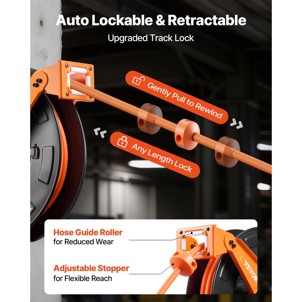 Bęben na wąż sprężonego powietrza VEVOR, zwijacz węża do hybrydowego węża sprężonego powietrza o średnicy 15 m x 9,5 mm, 20 bar, automatyczne zwijanie węża z kablem zasilającym o długości 1,52 m, montaż sufitowy/ścienny, podwójne ramię ze stali - Narzędzia pneumatyczne i kompresory | Galaxy Sklep