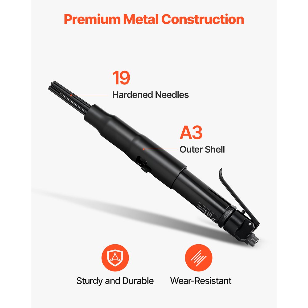 Mocny i wydajny: Ten pneumatyczny skaler igłowy generuje 3400 uderzeń na minutę (BPM) o wysokiej częstotliwości, co zapewnia dużą siłę uderzenia i pozwala skutecznie usuwać rdzę, farbę, żużel spawalniczy i brud z powierzchni metalowych. (Ciśnienie powietrza: 90 PSI; Wlot powietrza: 1/4 NPT)