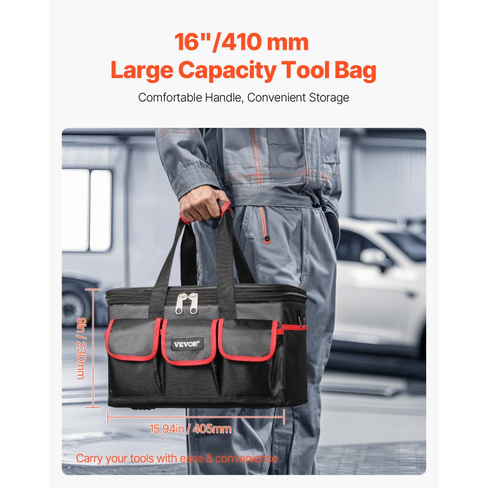 Duża torba narzędziowa: Izolowana torba narzędziowa o szerokości 16 cali (41 cm) oferuje dużo miejsca do przechowywania i wygodną rączkę, zapewniając użytkownikowi niezrównany komfort i przenośność