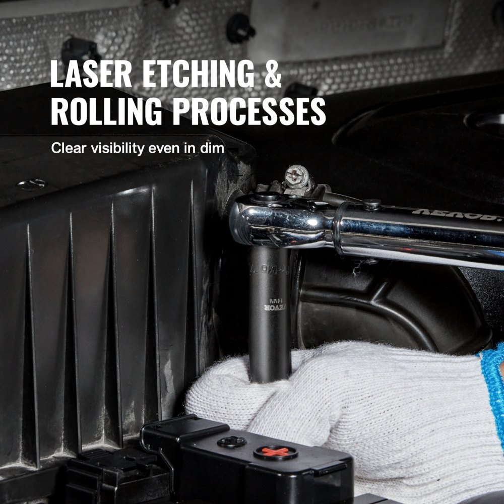 Stop Cr-V klasy przemysłowej: Nasz zestaw nasadek 3/8 cala ze stali stopowej Cr-V klasy przemysłowej jest wykonany z wysokiej jakości, odpornej na uderzenia stali stopowej, oferując wyjątkową poprawę odporności na uderzenia i pochłaniania energii. Obróbka cieplna w próżni szybko nagrzewa i schładza stal, tworząc polerowaną i niezwykle trwałą powierzchnię, dzięki czemu nadaje się do szerokiego zakresu zastosowań.