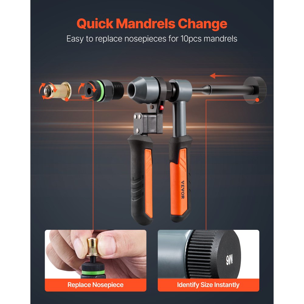 Bezproblemowa zmiana rozmiaru: Zmiana między 10 rozmiarami trzpieni w kilka sekund – bez użycia narzędzi. Każdy rozmiar jest wyraźnie oznaczony, co ułatwia szybką identyfikację, dzięki czemu narzędzie do nitonakrętek z łatwością poradzi sobie z różnymi rozmiarami nitonakrętek w każdym zastosowaniu.