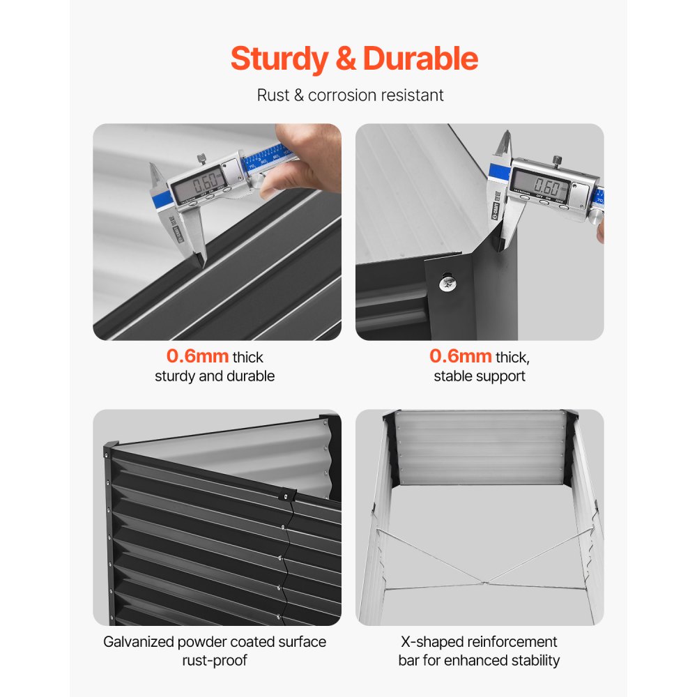 Solidne i trwałe: To metalowe, podwyższone łóżko posiada metalowe panele boczne o grubości 0,4 mm oraz metalowe łączniki narożne o grubości 0,6 mm. Powierzchnia jest ocynkowana i malowana proszkowo, aby zapobiec rdzewieniu i korozji, co gwarantuje długotrwałe użytkowanie na zewnątrz. Cztery wewnętrzne pręty wzmacniające w kształcie litery X zapewniają dodatkową stabilność i zapobiegają przewróceniu się łóżka podczas silnego wiatru. Przygotuj się na odważne stawianie czoła wyzwaniom na świeżym powietrzu!