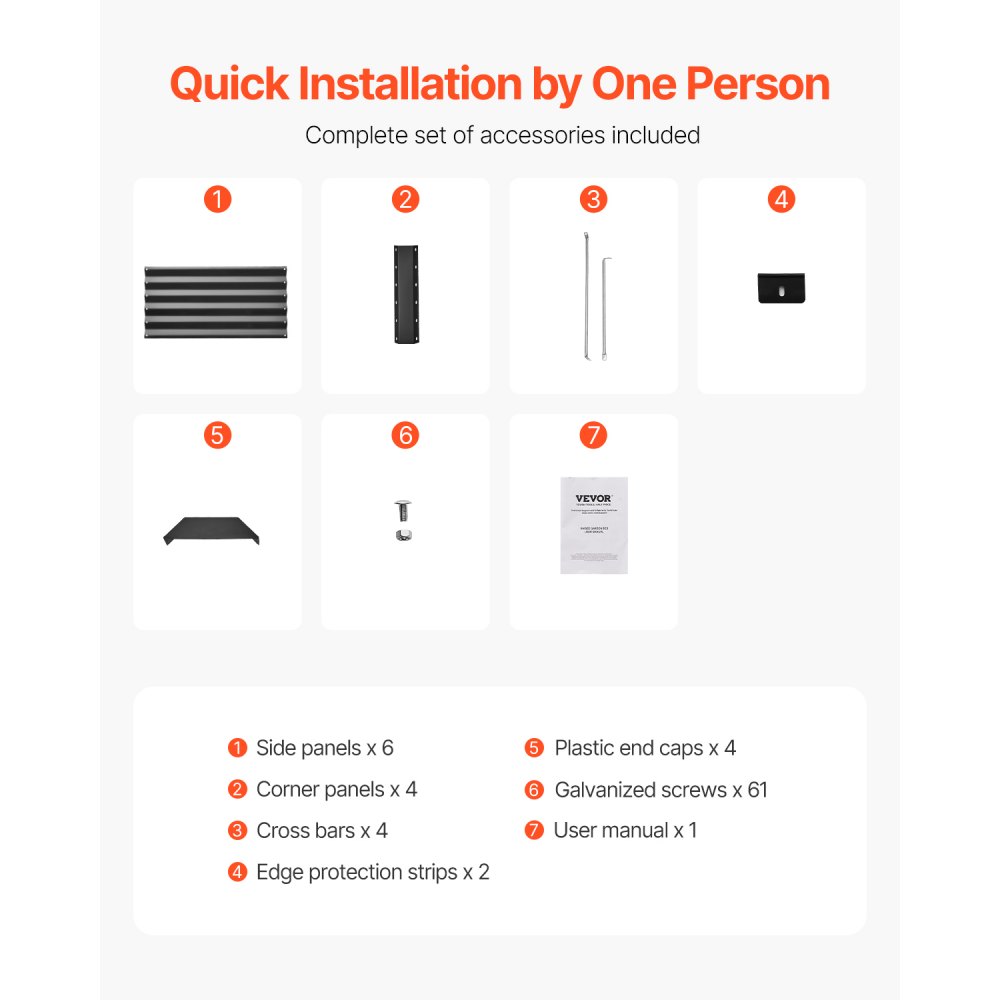 Co otrzymasz: Nasze podwyższone łóżko obejmuje 6 paneli bocznych, 4 panele narożne, 4 poprzeczki, 2 listwy zabezpieczające krawędzie, 4 plastikowe zaślepki, 61 ocynkowanych śrub i instrukcję obsługi.