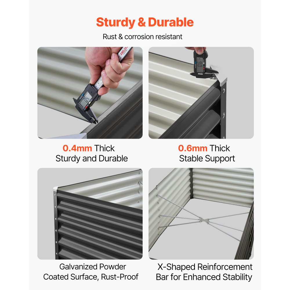 Wytrzymała i niezawodna: Ta metalowa, podniesiona grządka składa się z paneli bocznych o grubości 0,4 mm i łączników narożnych o grubości 0,6 mm. Jest odporna na rdzę dzięki ocynkowanej, malowanej proszkowo powierzchni. Sześć wewnętrznych podpór w kształcie litery X zapewnia dodatkową stabilność i zapobiega przewróceniu się na wietrze.
