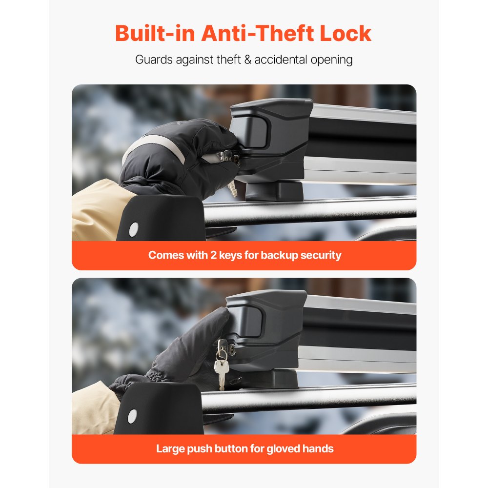 Zabezpieczenie antykradzieżowe: Ten bagażnik na narty jest wyposażony w zintegrowane zabezpieczenie antykradzieżowe, które zapewnia bezpieczeństwo sprzętu podczas podróży. W zestawie znajdują się dwa kluczyki, które zapobiegają utracie sprzętu. Duże przyciski umożliwiają łatwą obsługę, nawet w rękawiczkach.