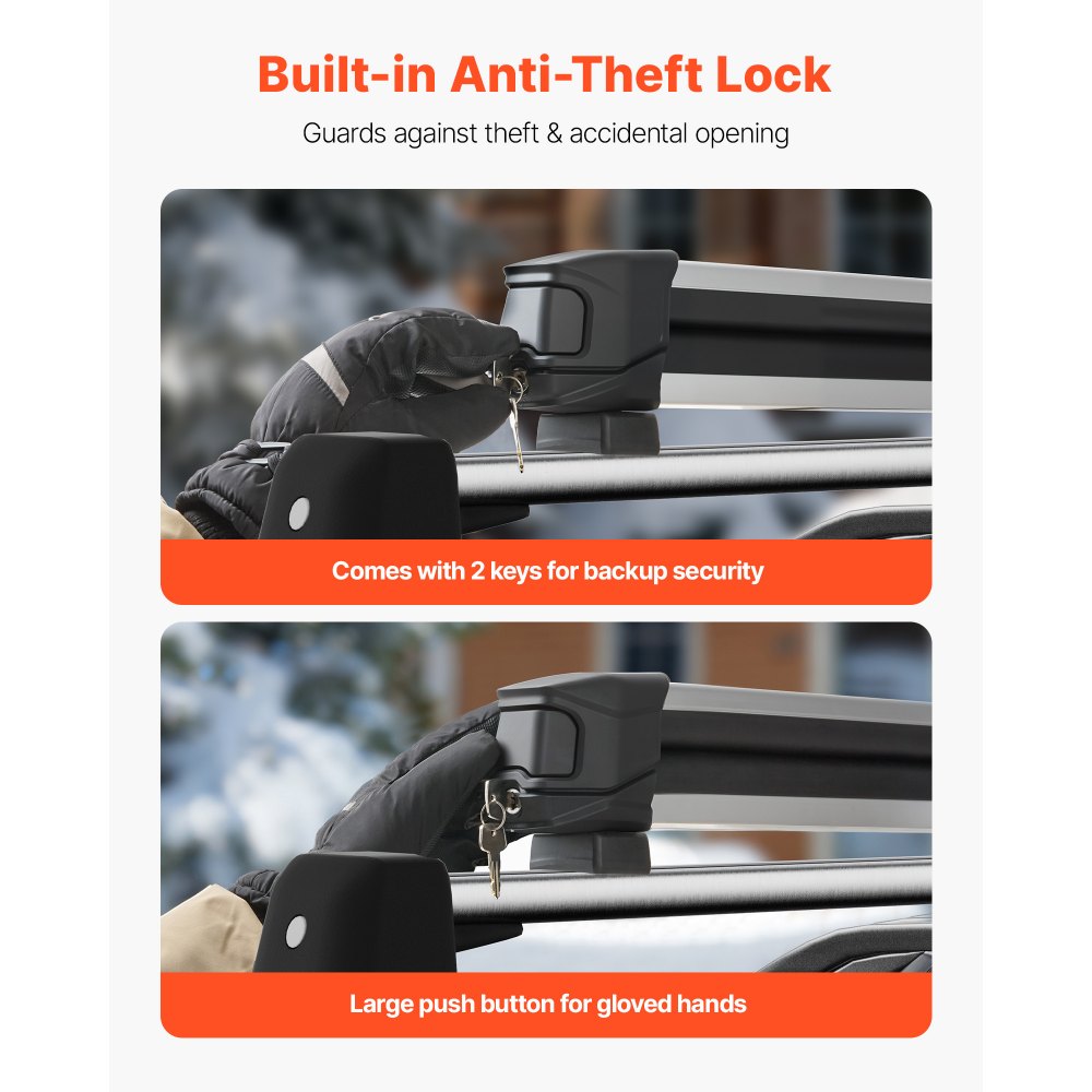 Zabezpieczenie antykradzieżowe: Ten bagażnik na narty jest wyposażony w zintegrowane zabezpieczenie antykradzieżowe, które zapewnia bezpieczeństwo sprzętu podczas podróży. W zestawie znajdują się dwa kluczyki, które zapobiegają utracie sprzętu. Duże przyciski umożliwiają łatwą obsługę, nawet w rękawiczkach.