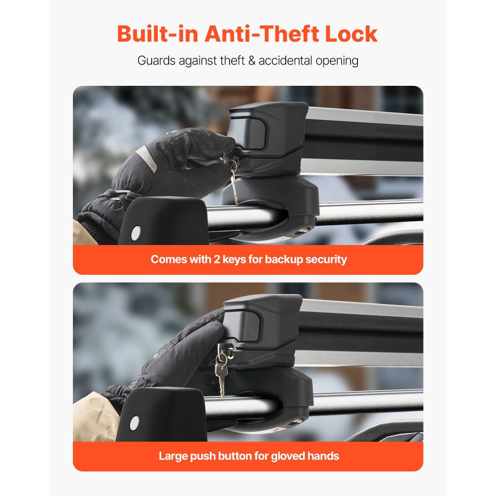 Zabezpieczenie antykradzieżowe: Ten bagażnik na narty jest wyposażony w zintegrowane zabezpieczenie antykradzieżowe, które zapewnia bezpieczeństwo sprzętu podczas jazdy na nartach. W zestawie znajdują się dwa kluczyki, które zapobiegają utracie sprzętu. Duże przyciski umożliwiają łatwą obsługę, nawet w rękawiczkach.