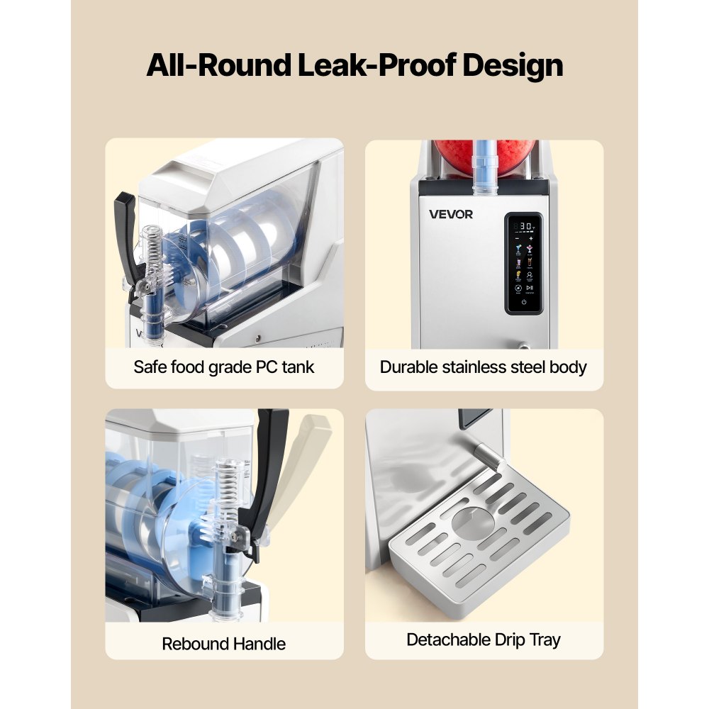 Łatwy w użyciu: Obsługa tego urządzenia do produkcji slushie jest niezwykle prosta: wystarczy wlać płyn i wybrać program. Pięć poziomów konsystencji pozwala wybrać między gęstszymi a lżejszymi napojami, a ergonomiczny uchwyt zapewnia wygodną kontrolę i sprawia, że napełnianie i nalewanie jest bezproblemowe.
