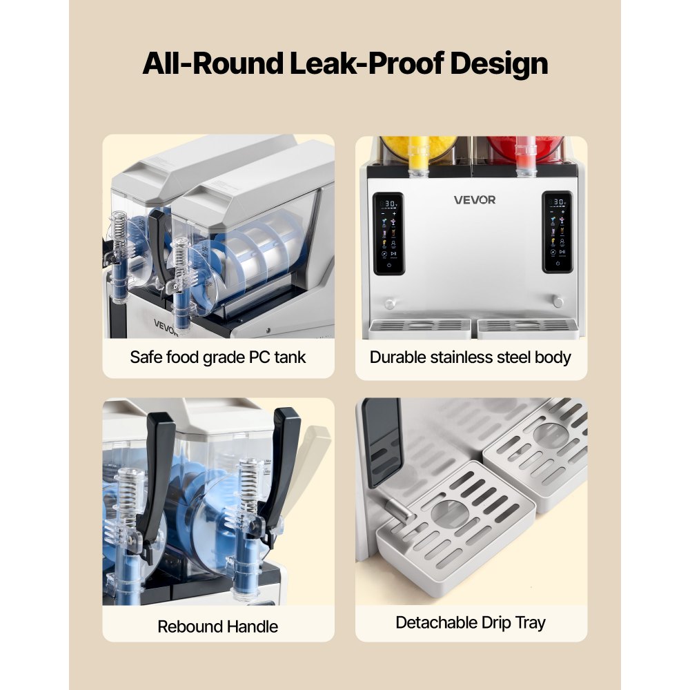 Łatwy w użyciu: Obsługa tego urządzenia do produkcji slushie jest niezwykle prosta: wystarczy wlać płyn i wybrać program. Pięć poziomów konsystencji pozwala wybrać między gęstszymi a lżejszymi napojami, a ergonomiczny uchwyt zapewnia wygodną kontrolę i sprawia, że napełnianie i nalewanie jest bezproblemowe.