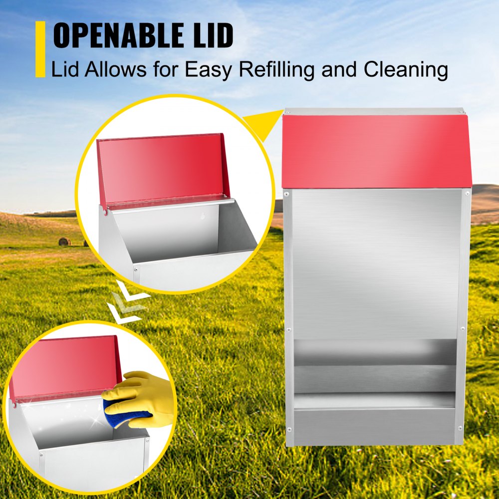 Oszczędność czasu i oszczędność: nasz podajnik dla drobiu jest wyposażony w otwieraną pokrywę; Otwierasz je, gdy chcesz uzupełnić jedzenie, co jest łatwe i nie zajmuje dużo czasu. Dzięki otwieranej pokrywie z łatwością wyczyścisz także karmnik dla kurczaków. Dzięki naszemu karmnikowi nie musisz już spieszyć się do domu, aby nakarmić swoje kurczaki.