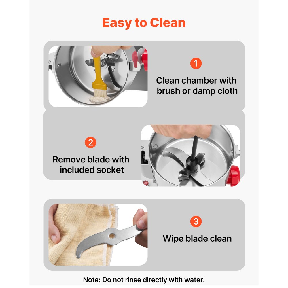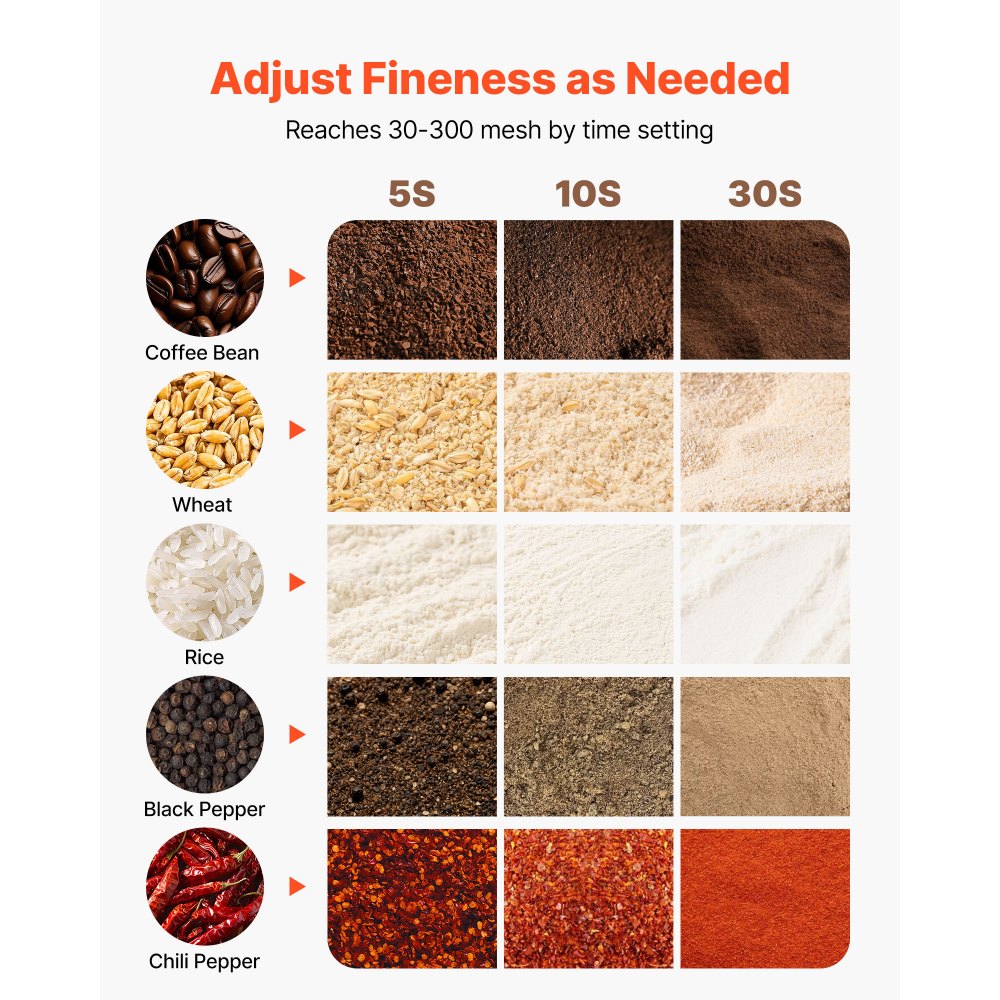 Wielofunkcyjny młynek do produktów suchych: Ten elektryczny młynek do zboża nadaje się do mielenia zbóż (pszenicy, soi, kukurydzy, ziaren kawy) oraz przypraw (pieprzu, cynamonu, anyżu). Twardsze składniki należy wcześniej zgnieść. Nie nadaje się do wilgotnych, oleistych ani lepkich materiałów i jest szeroko stosowany w kuchniach i laboratoriach.