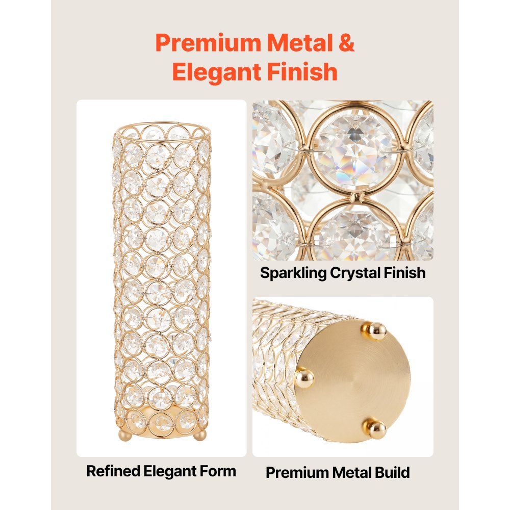 Elegancki design: Ten wazon ślubny zachwyca cylindrycznym, kryształowym kształtem, ozdobionym francuskim złotym wykończeniem i kryształowymi koralikami, tworząc czysty, a zarazem elegancki wygląd. Jego zrównoważona struktura dodaje mu wizualnej wagi i stabilności, czyniąc go stylową ozdobą stołu.