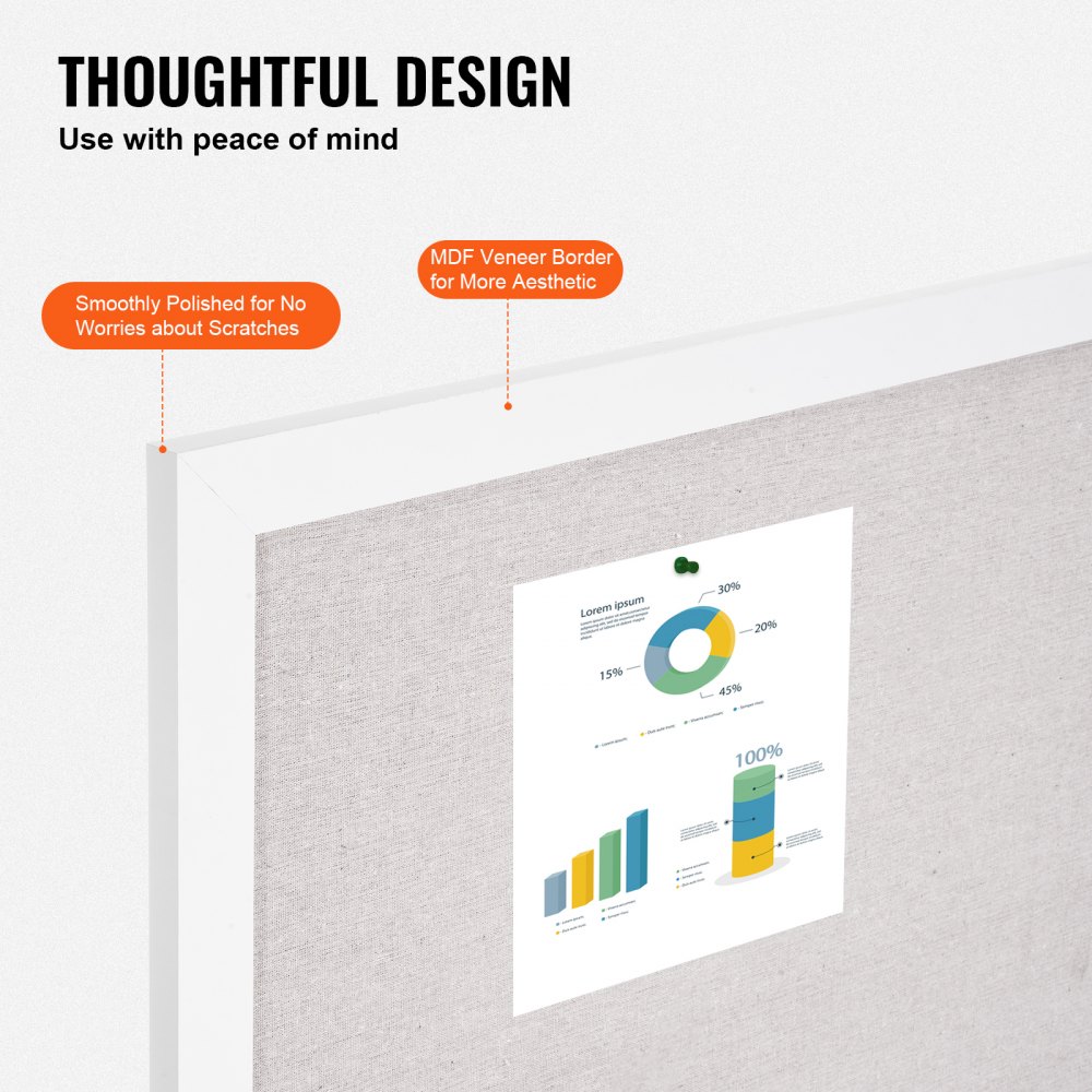 Ulepszona powierzchnia płótna: Nasza tablica ogłoszeń ma białą powierzchnię poliestrowo-bawełnianą z rdzeniem z płyty pilśniowej o grubości 7 mm. Została zaprojektowana tak, aby zapobiegać powstawaniu nieestetycznych dziurek, nawet po długotrwałym użytkowaniu. Powierzchnia jest wzmocniona klejem i preszpanem, aby zapobiec wgnieceniom i zapewnić bezpieczny i stabilny montaż.