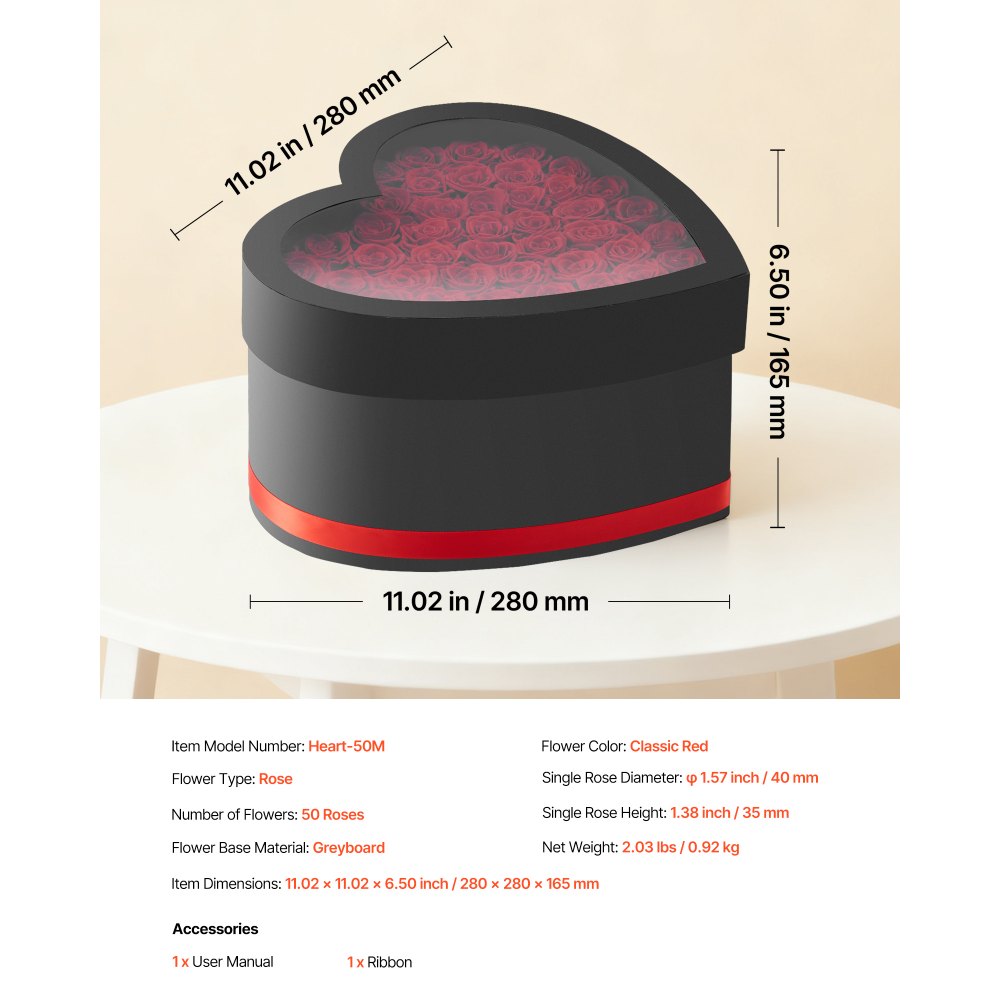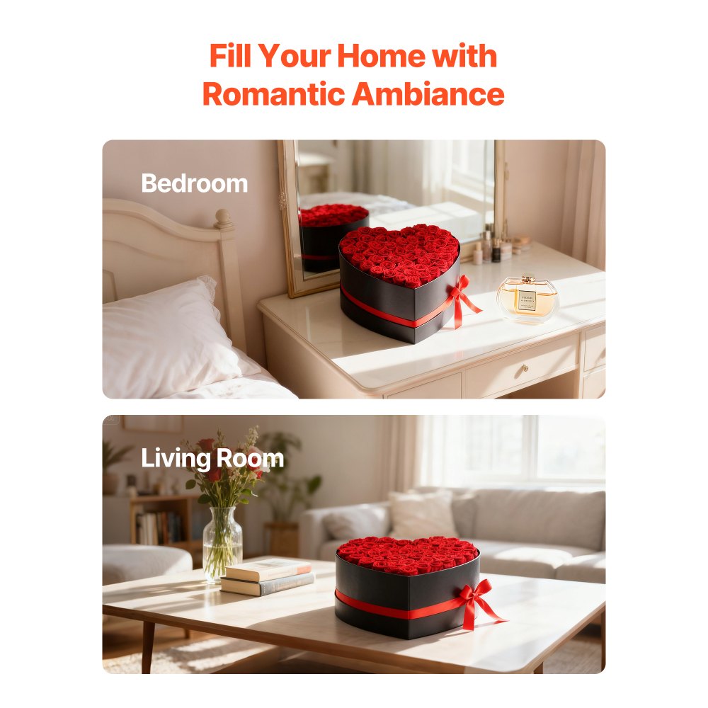Wieczne róże: Każda wieczna róża wykonana jest z 50 prawdziwych, zakonserwowanych róż. Każda wieczna róża jest starannie zapakowana w pudełko w kształcie serca, co zapewnia żywą, elegancką i romantyczną prezentację.