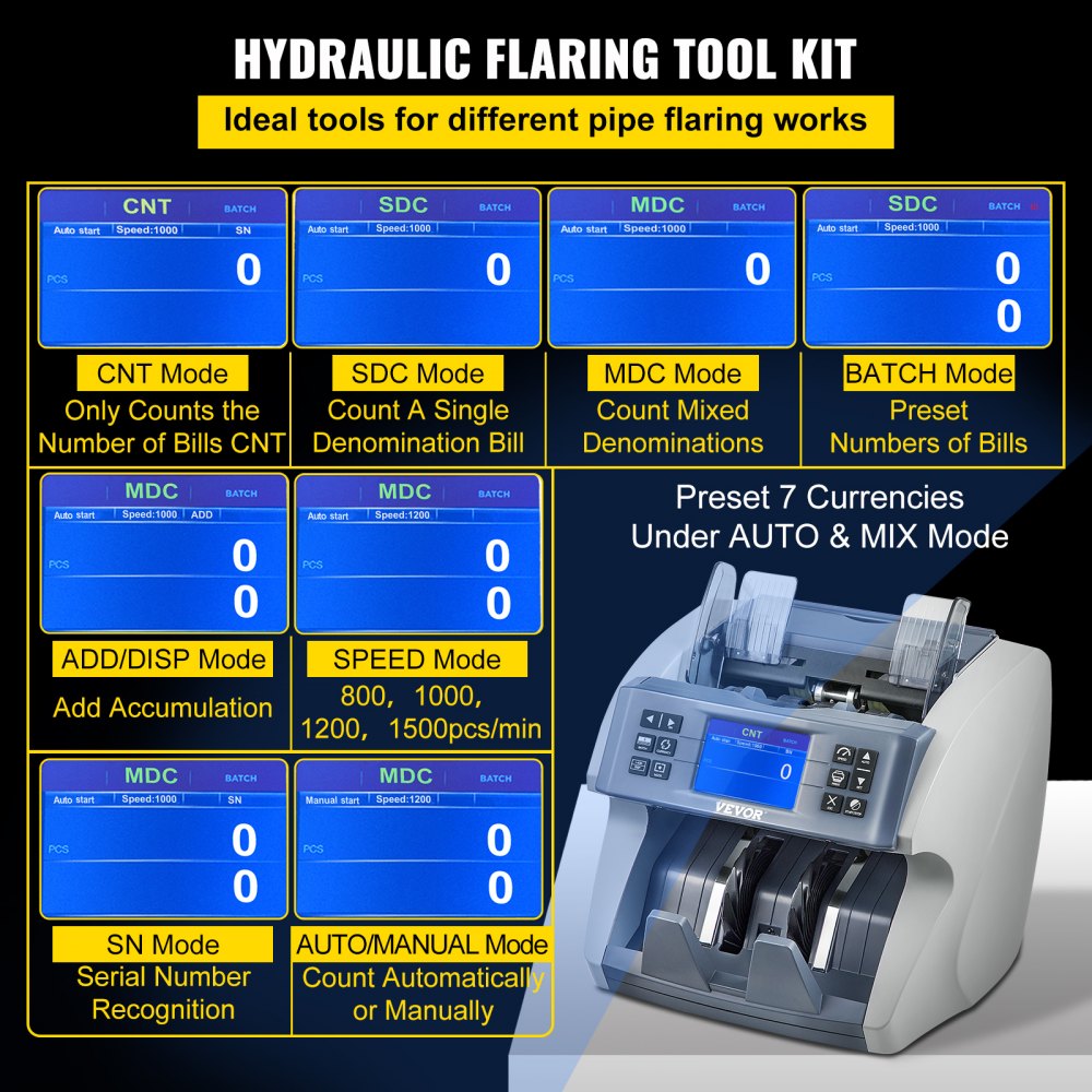 Wiele trybów pracy: Oferujemy 8 opcji, które spełnią Twoje zróżnicowane potrzeby, zapewniając wygodę i oszczędność czasu. Ponadto, w tej liczarce pieniędzy możesz ustawić 7 walut. Tryb automatyczny i mieszany. Tryb CNT: Liczy tylko określoną liczbę banknotów. Tryb SDC: Liczy pojedynczy banknot. Tryb MDC: Liczy mieszane nominały. Tryb SN: Rozpoznawanie numeru seryjnego. Tryb wsadowy: Ustawiona liczba banknotów. Tryb dodawania: Funkcja liczenia w górę podczas dodawania. Tryb automatyczny/ręczny: Liczy automatycznie lub ręcznie.