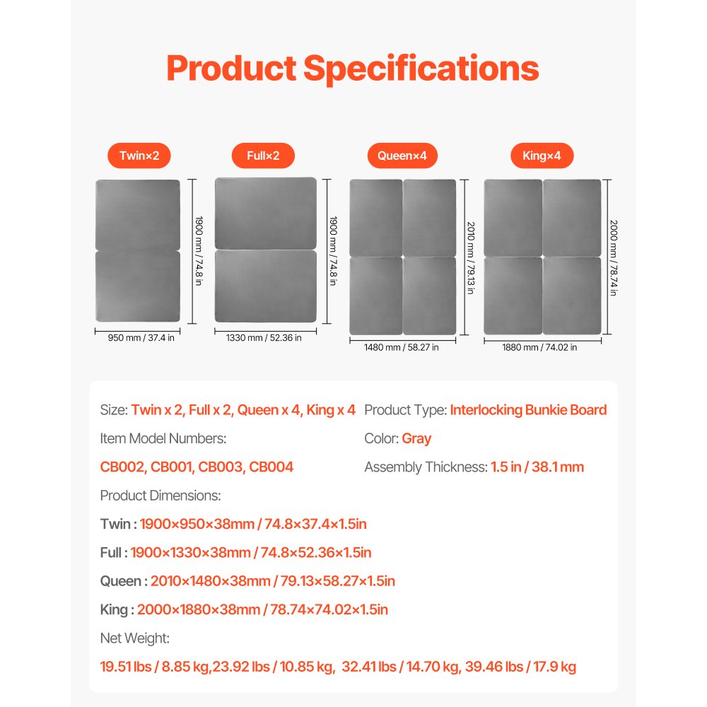 Deski Bunkie do łóżek pojedynczych 1900x950x38 mm, 2-częściowe, Deska Bunkie do stelaża łóżka z listew, Listwy podtrzymujące łóżko z tkaniną Oxford 200D, Drewniany materac nawierzchniowy, Stelaż materaca, Szary
