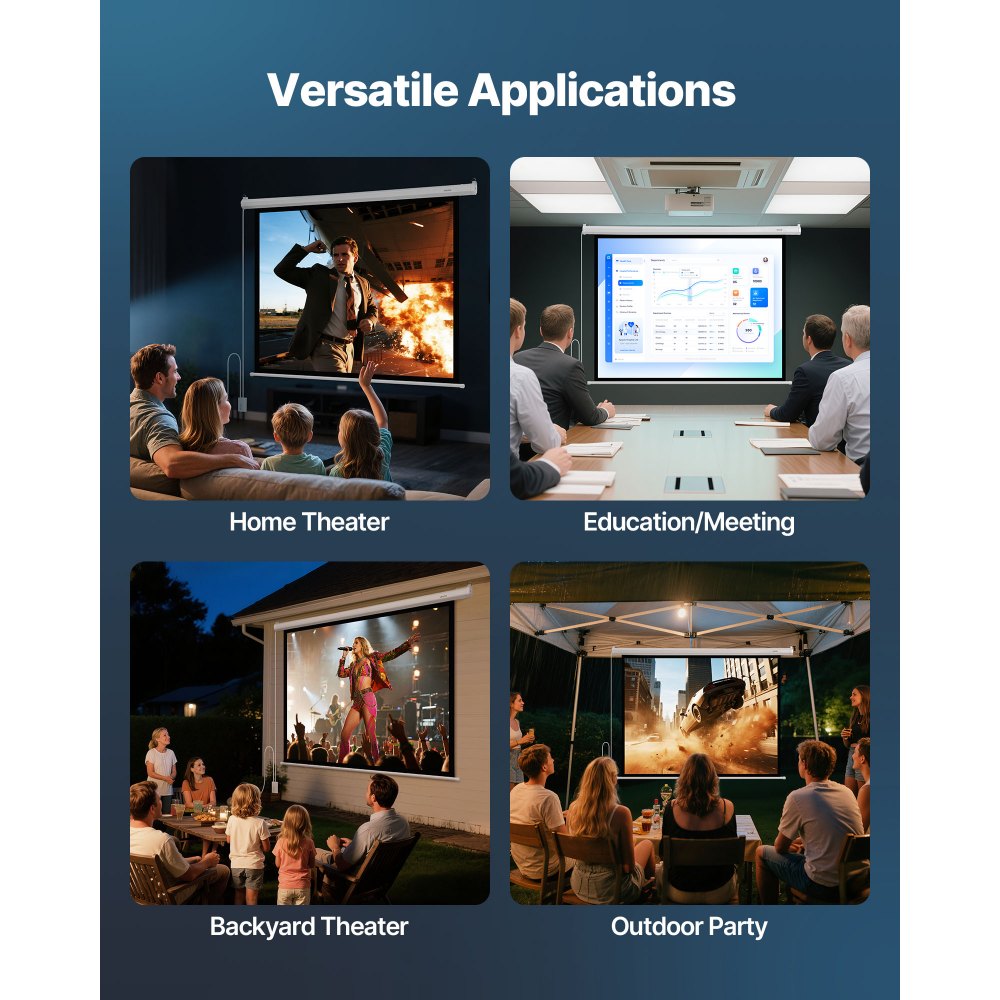 Wszechstronne zastosowanie: Pożegnaj ograniczenia małych telewizorów i monitorów. Nasz sterowany elektrycznie ekran projekcyjny oferuje prywatne wrażenia kinowe w dowolnym miejscu i czasie. Niezależnie od tego, czy jesteś w pomieszczeniu, czy na zewnątrz, każdy widz doświadczy żywego, krystalicznie czystego obrazu.