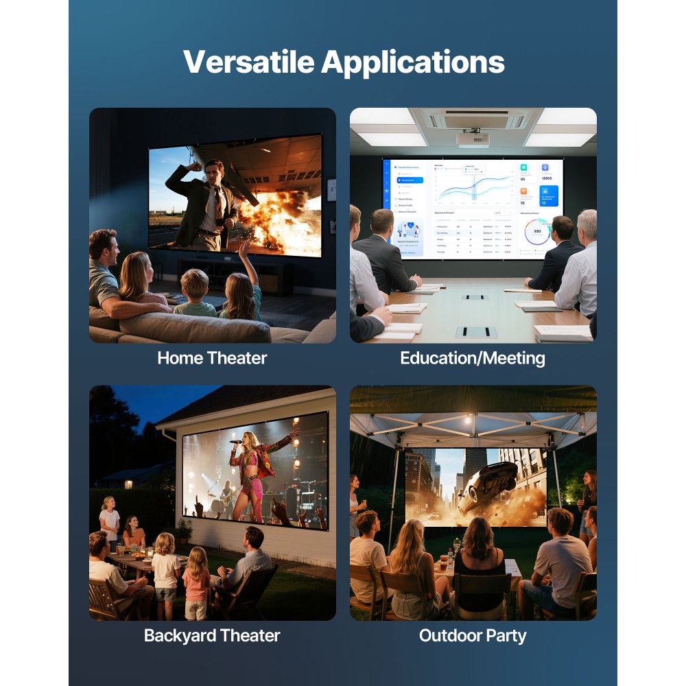 Wszechstronność: Pożegnaj ograniczenia małych telewizorów i monitorów. Nasz ekran projekcyjny oferuje prywatne wrażenia kinowe w dowolnym miejscu i czasie. Niezależnie od tego, czy w pomieszczeniu, czy na zewnątrz, każdy widz będzie mógł cieszyć się żywym, krystalicznie czystym obrazem.