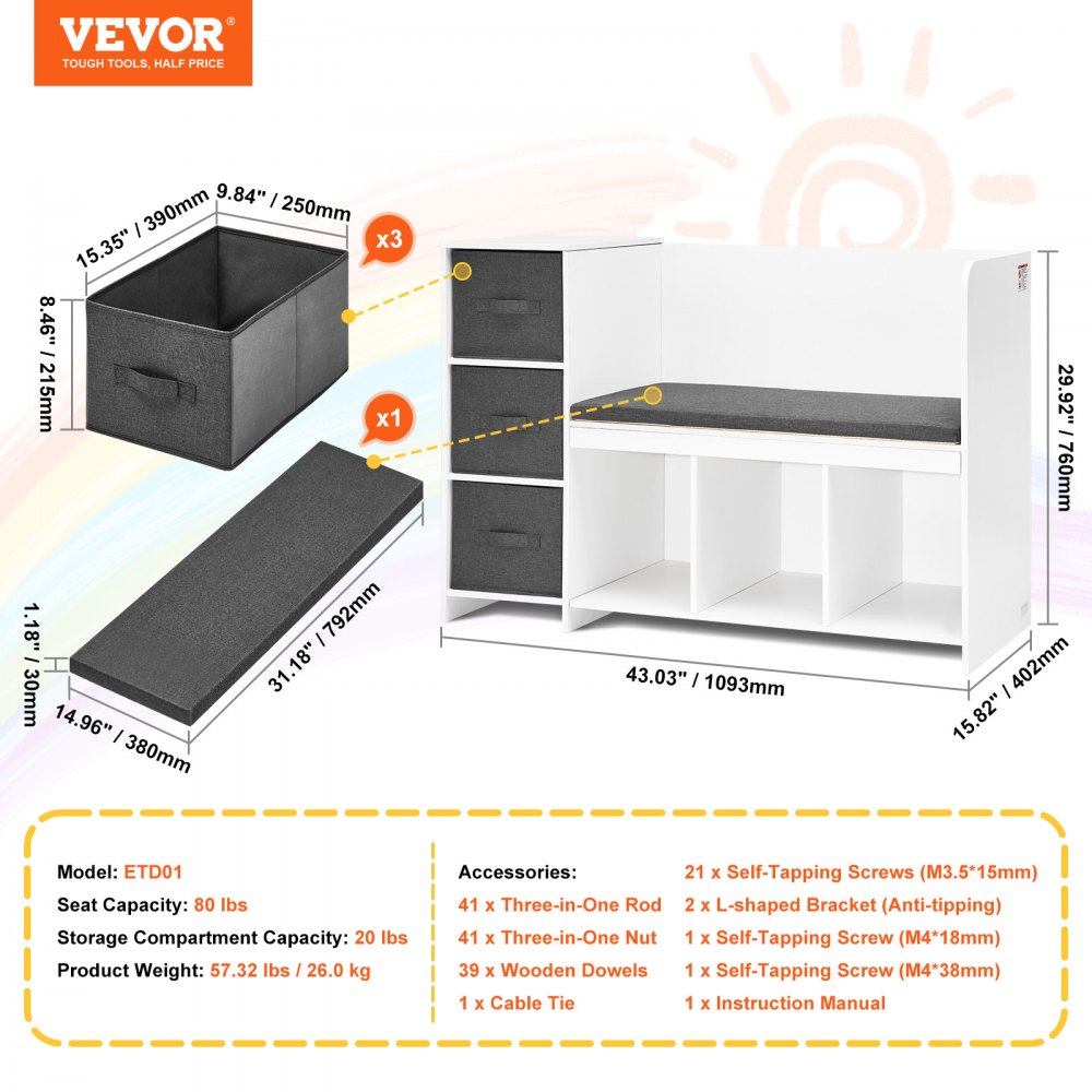 Ławka do czytania dla dzieci VEVOR, regał dla maluchów ze zdejmowaną poduszką na siedzisko, 6-poziomowa ławka ze schowkiem i 3 szufladami, idealna do pokoju zabaw, sypialni, salonu