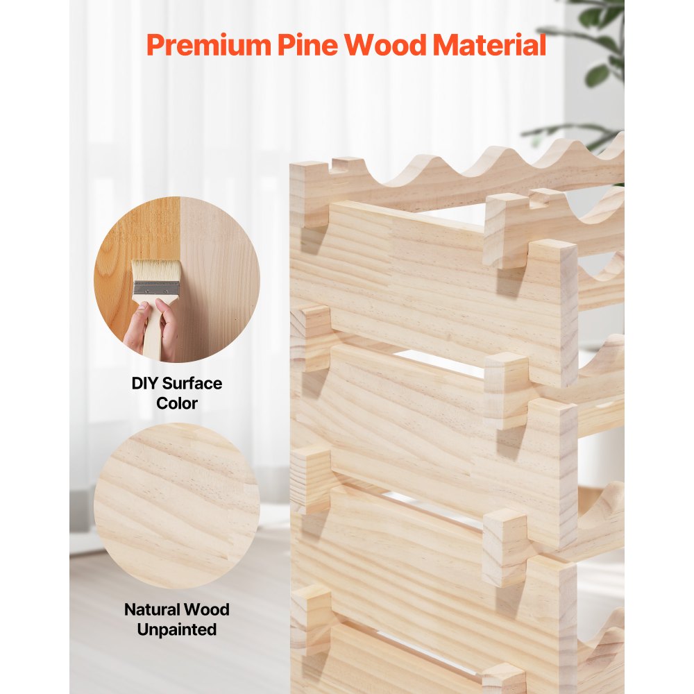 Wysokiej jakości drewno sosnowe: Nasz stojak na butelki wina charakteryzuje się drobno szlifowaną, gładką powierzchnią bez zadziorów i jest wyjątkowo odporny na pęknięcia. Ponieważ jest nieobrobiony, możesz dopasować kolor stojaka do swojej jadalni, kuchni lub piwniczki na wino.