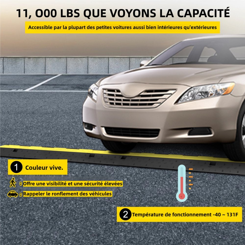 Maksymalna ładowność 4,989 kg: Tradycyjna czarno-żółta kolorystyka zapewnia lepszą widoczność w nocy i przy słabym oświetleniu. Rampa zabezpieczająca przed kablami charakteryzuje się unikalną konstrukcją, która przyciąga uwagę pieszych i kierowców, zachęcając ich do zwolnienia. Nośność 4,989 kg gwarantuje, że możesz przejechać po rampie samochodem bez uszkodzenia kabli w jej wnętrzu.