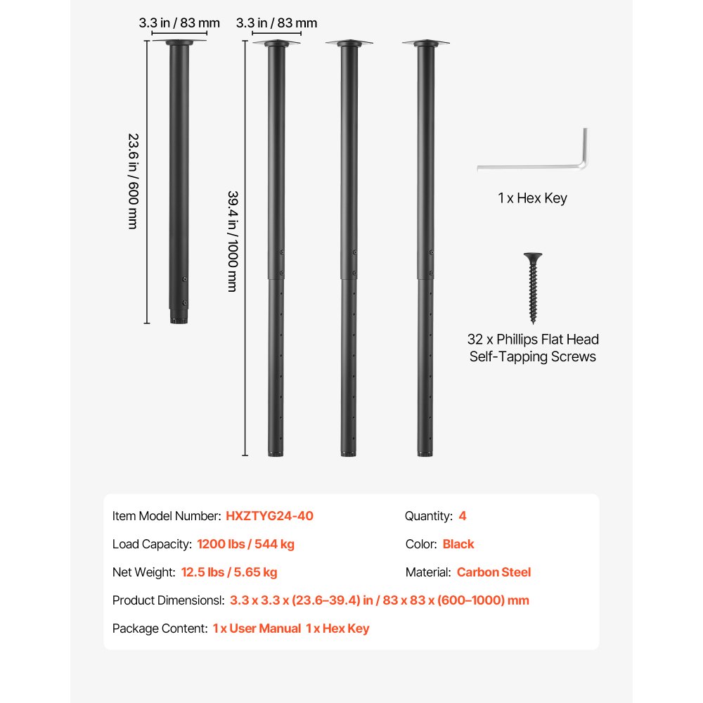 Nogi do stołu VEVOR, zestaw 4 szt., nogi meblowe o regulowanej wysokości 60–100 cm, nogi do stołu maks. 544 kg, nogi teleskopowe ze stali węglowej, do biurek, stolików kawowych, stołów jadalnych, stołów warsztatowych, okrągłe - Artykuły biurowe | Galaxy Sklep