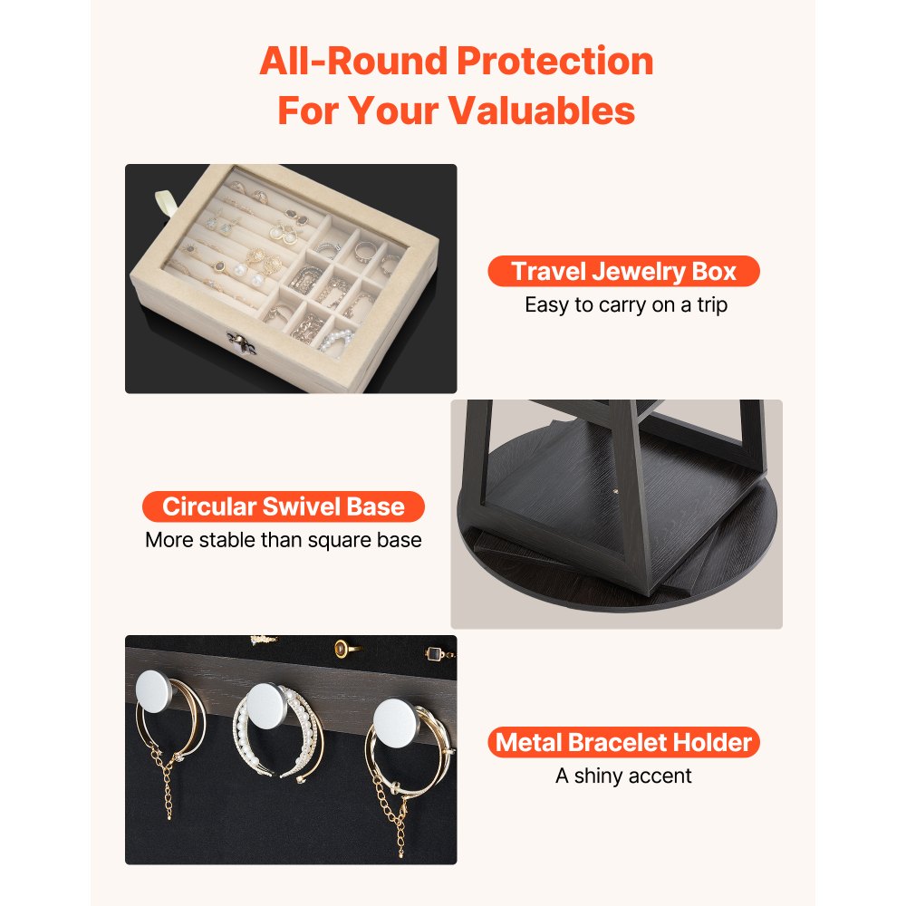 Funkcjonalny design 3 w 1: To coś więcej niż tylko szafka na biżuterię – to obrotowe lustro na biżuterię to lustro o pełnej długości, obracające się o 360° i zintegrowane z lustrem do makijażu. Przechowuj buty i torebki poniżej, aby mieć pod ręką swój strój i wyglądać pewnie na każdą okazję.