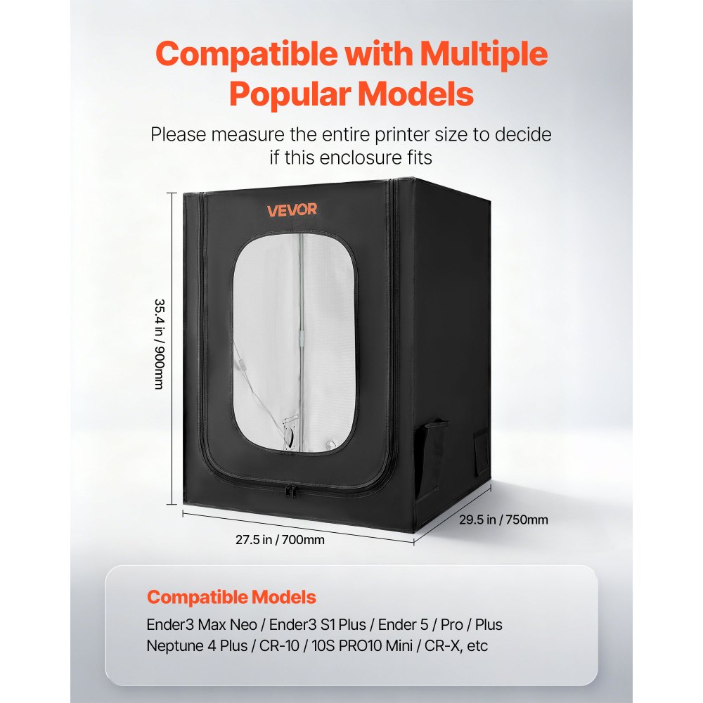Szeroka kompatybilność: Nasz namiot na drukarkę 3D o wymiarach 70 x 75 x 90 cm (27,5 x 29,5 x 35,4 cala) z łatwością pomieści urządzenia Ender 3 S1 Plus, Ender 3 Max, Ender 3 Max Neo, Ender 5 S1, Ender 5 Pro, Ender 5 Plus, CR-10 V3, CR-10S Pro V2, CR-10S i wiele innych. Przed złożeniem zamówienia należy zmierzyć drukarkę, aby upewnić się, że jest kompatybilna.