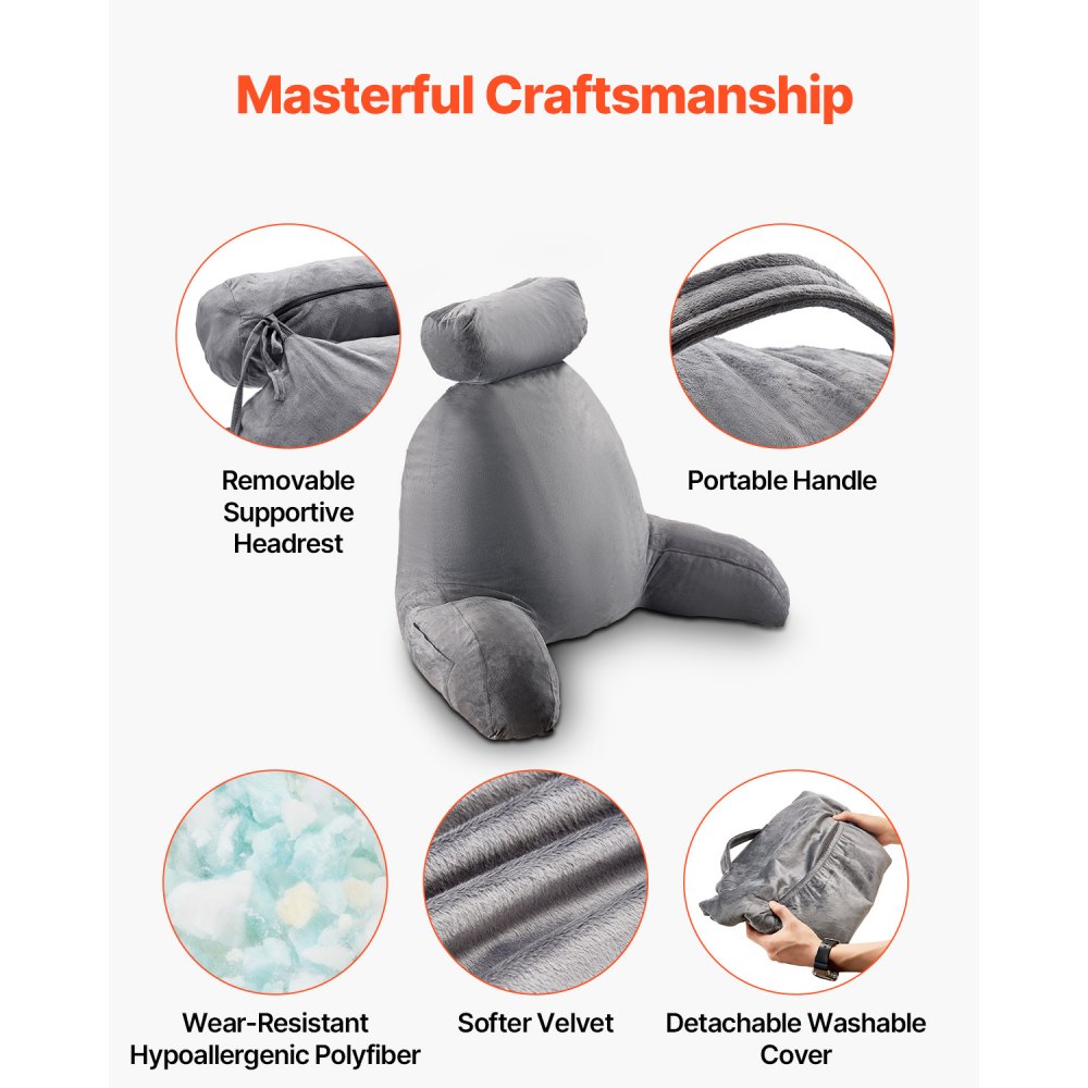 Poduszka do czytania VEVOR (duża) z wyjmowanym zagłówkiem, poduszką na oparcie z 3 kieszeniami, zmywalnym krótkim aksamitnym materiałem i rozdrobnioną pianką memory, bokiem z uchwytem, do oglądania telewizji, czytania i grania
