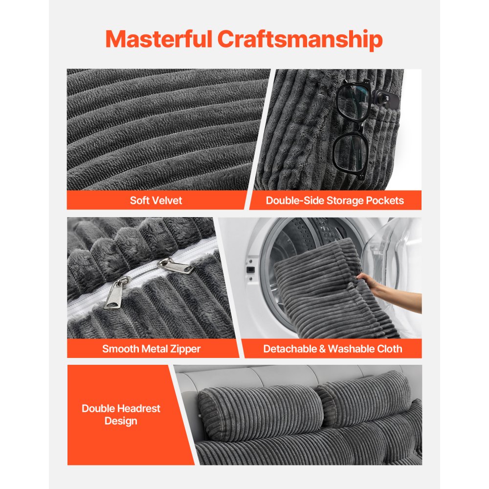 Poduszka klinowa na zagłówek VEVOR (rozmiar queen) z 2 kieszeniami bocznymi i 2 zagłówkami, poduszka klinowa z zmywalną flanelą, do czytania, zabawy, pracy, szara (1510 x 205 x 530 mm)