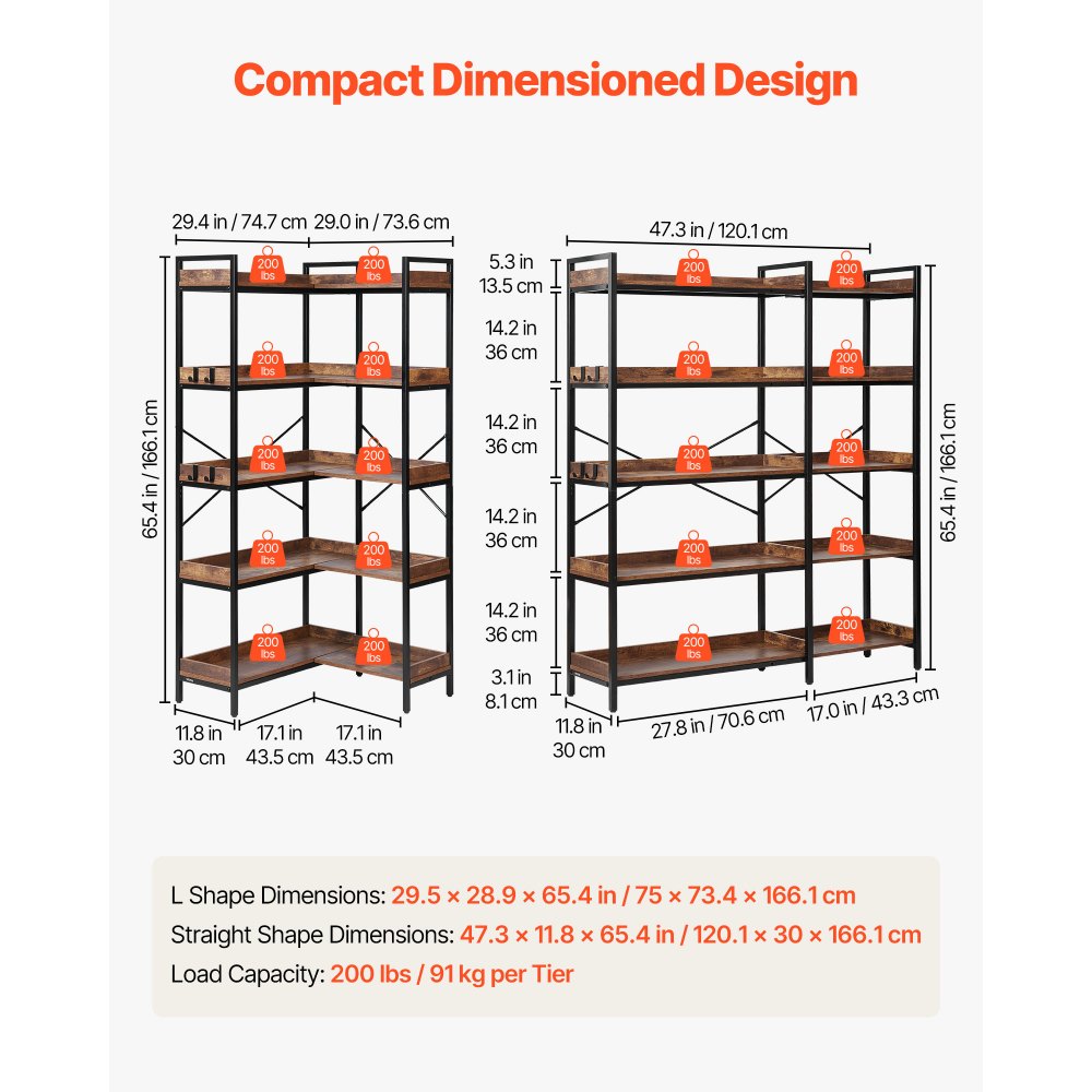 Półka narożna VEVOR 5-poziomowa, wysoka półka narożna z 4 haczykami, regał ekspozycyjny z metalową ramą i drewnianymi półkami, regał wystawowy do sypialni, salonu, biura, brązowy - Artykuły biurowe | Galaxy Sklep