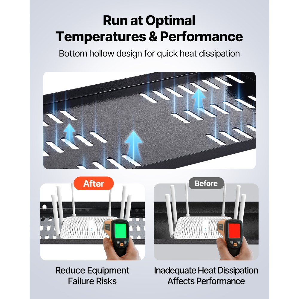 Optymalna wentylacja: Dzięki wentylowanej podstawie nasza półka rackowa skutecznie obniża temperaturę urządzeń, zapewniając stabilną pracę i zmniejszając ryzyko awarii. Zapewnij płynną pracę urządzeń i dłuższą żywotność.