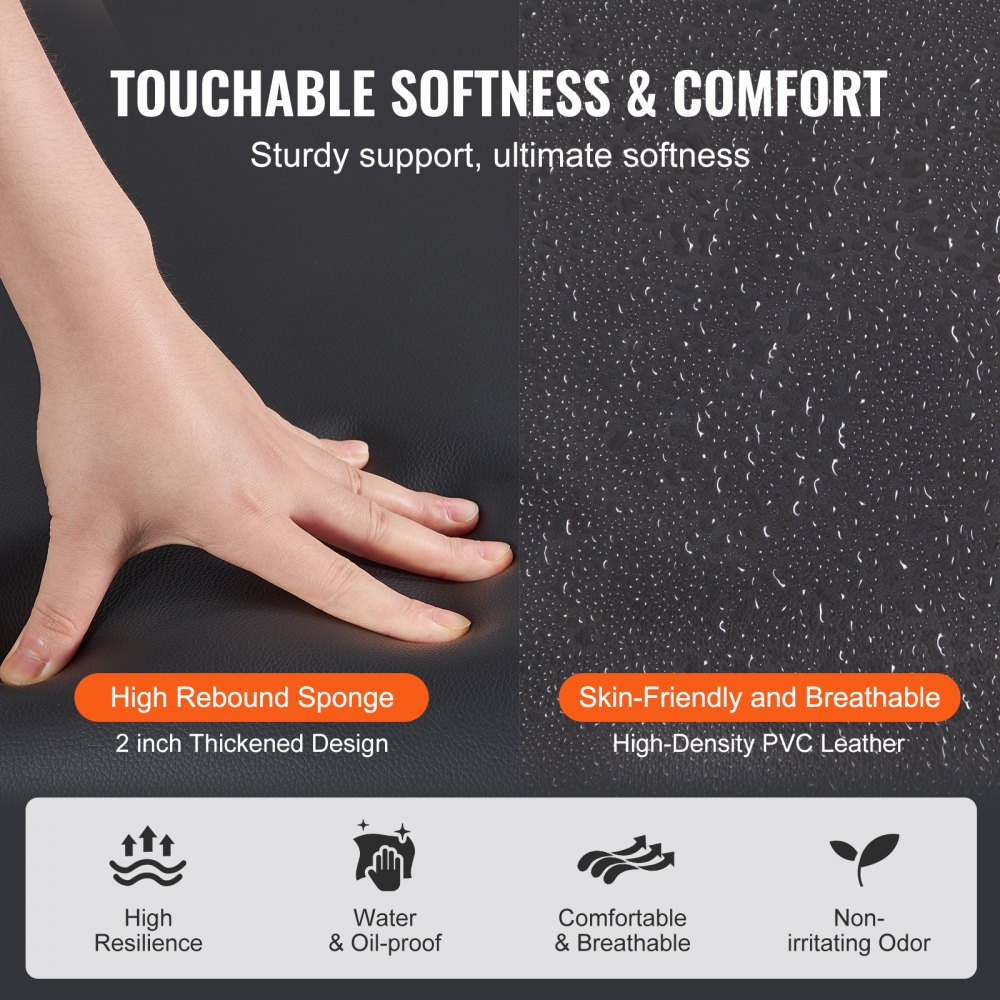 Miękki i wygodny: Dzięki przestronnemu blatowi o szerokości 700 mm (28 cali) i rozszerzonym bocznym podłokietnikom, ten przenośny stół do masażu oferuje klientom dużo miejsca do rozciągania się. Gąbka o wysokiej gęstości o grubości 50 mm (2 cale) zachowuje swój kształt, a miękka skóra PVC zapewnia komfort i delikatność dla skóry. Regulowany podnóżek zapewnia oparcie dłoniom, zapewniając maksymalną pielęgnację i komfort.