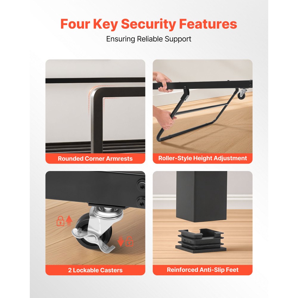 Solidna metalowa rama: Cała rama jest wykonana z solidnego metalu o maksymalnym udźwigu 400 funtów (181,44 kg), co zapewnia stabilność podczas użytkowania. Powłoka antykorozyjna zwiększa odporność ramy na wilgoć i korozję, wydłużając jej trwałość.