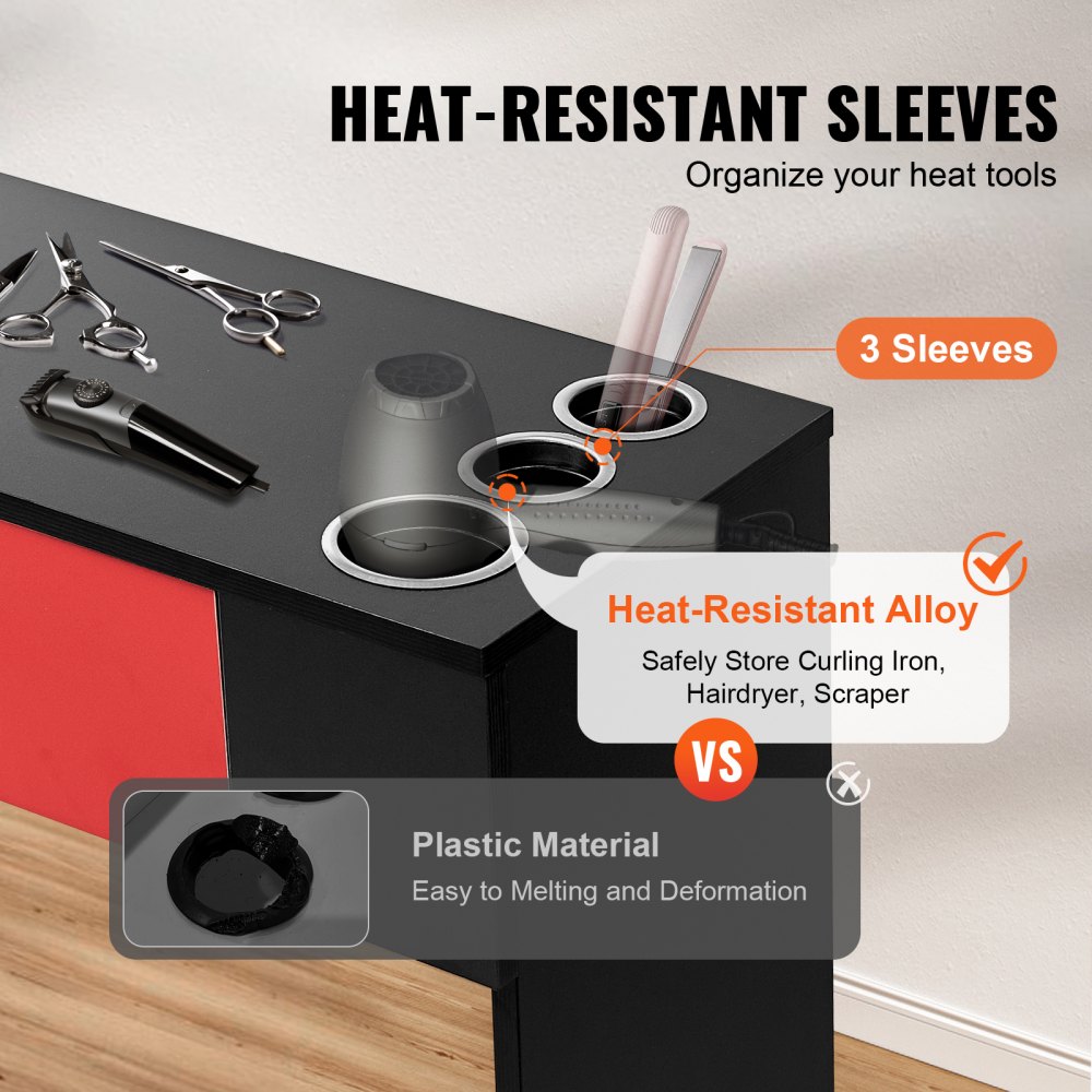 Osłony narzędzi odporne na ciepło: Stanowisko fryzjerskie wykonane jest ze stopu odpornego na ciepło i ma trzy osłony na narzędzia odporne na ciepło, przy czym dolna pokrywa zapobiega ich upadkowi, zapewniając w ten sposób bezpieczeństwo podczas użytkowania.