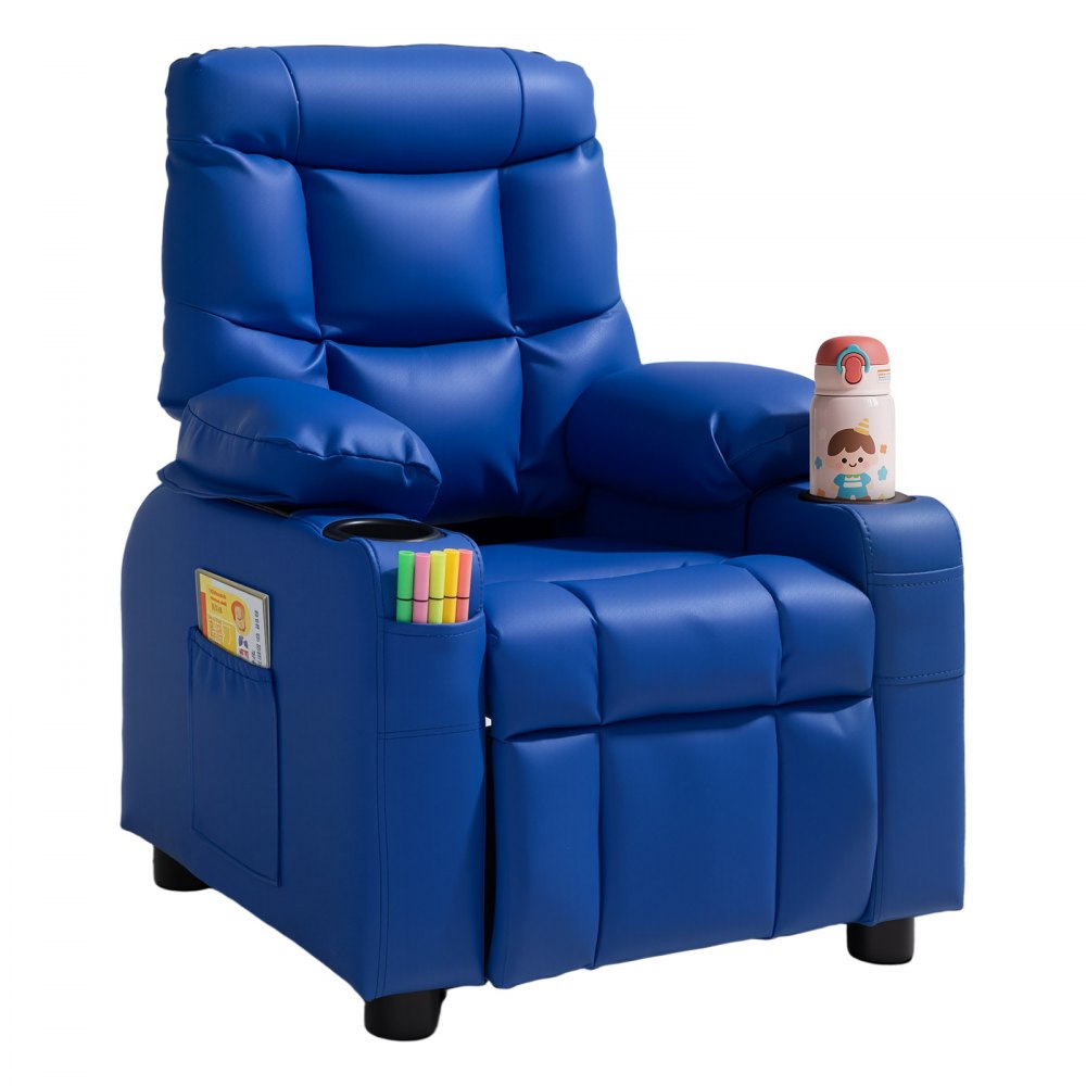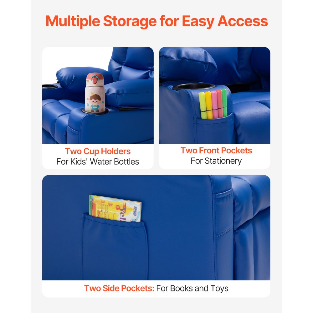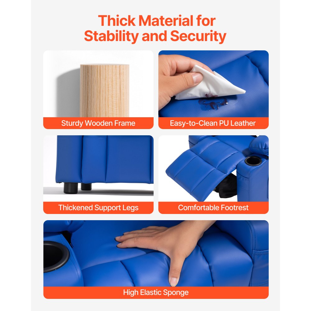 Sofa dziecięca VEVOR z uchwytami na kubki i kieszeniami bocznymi, fotel dziecięcy z regulowanym oparciem i podnóżkiem w zakresie 107°–126°, fotel rozkładany ze skóry PU z podnóżkiem, odpowiedni dla dzieci (niebieski) - Artykuły biurowe | Galaxy Sklep
