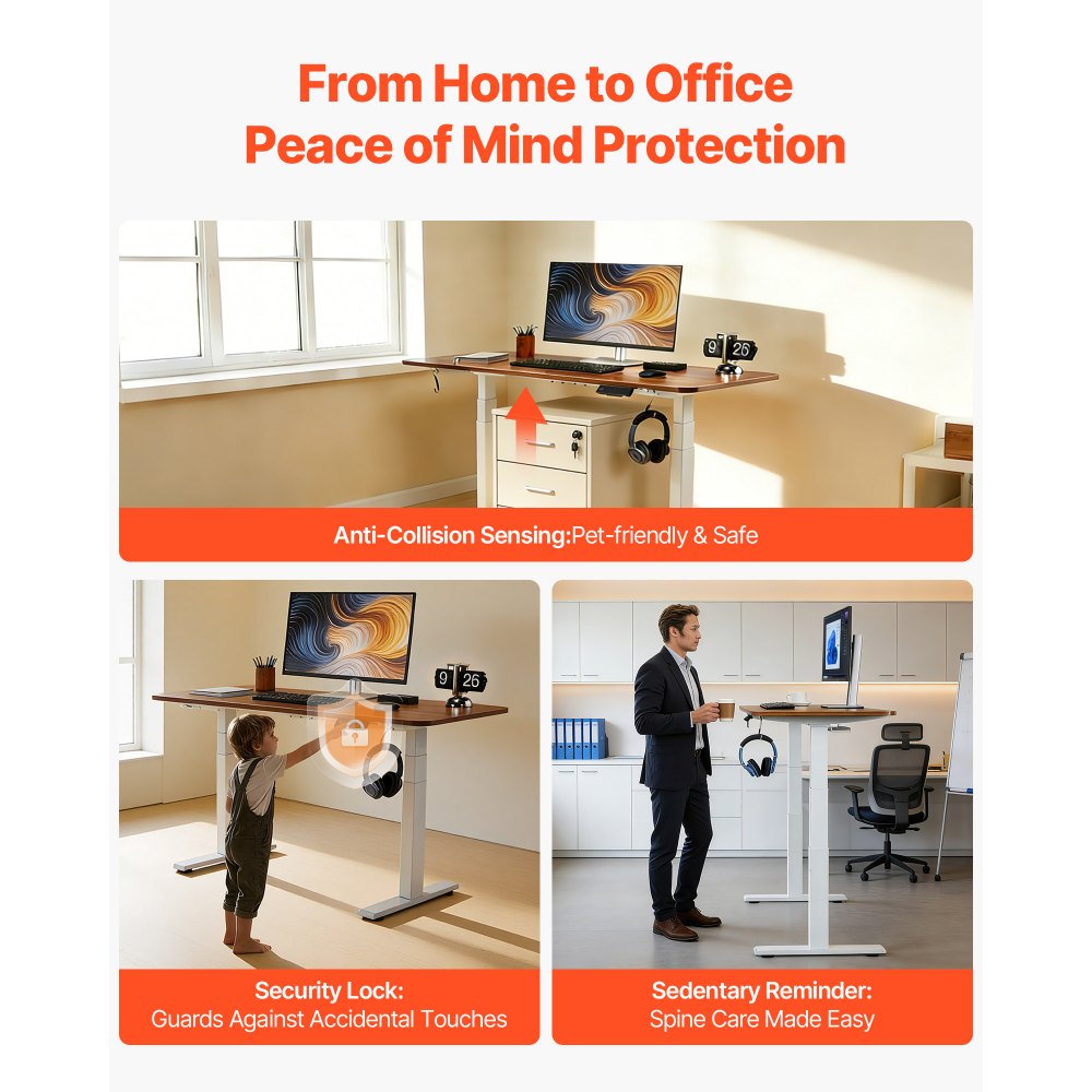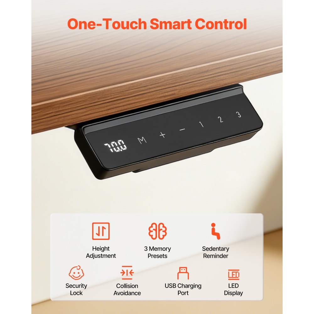 Inteligentny panel sterowania: Regulowana rama biurka oferuje 3 zaprogramowane ustawienia do szybkiej regulacji wysokości. Posiada również funkcję przypomnienia o braku ruchu, mechanizm blokujący, zabezpieczenie przed kolizją oraz port USB do wygodnego ładowania.