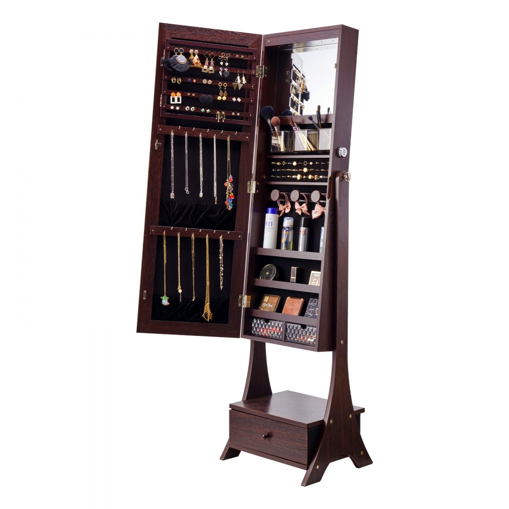 Szafka na biżuterię z lustrem VEVOR, stojące lustro z miejscem do przechowywania, zamykany organizer na biżuterię z lustrem na całej długości, aksamitną wyściółką, oświetleniem wewnętrznym LED i szufladą, szafka na biżuterię, brązowa - Artykuły biurowe | Galaxy Sklep