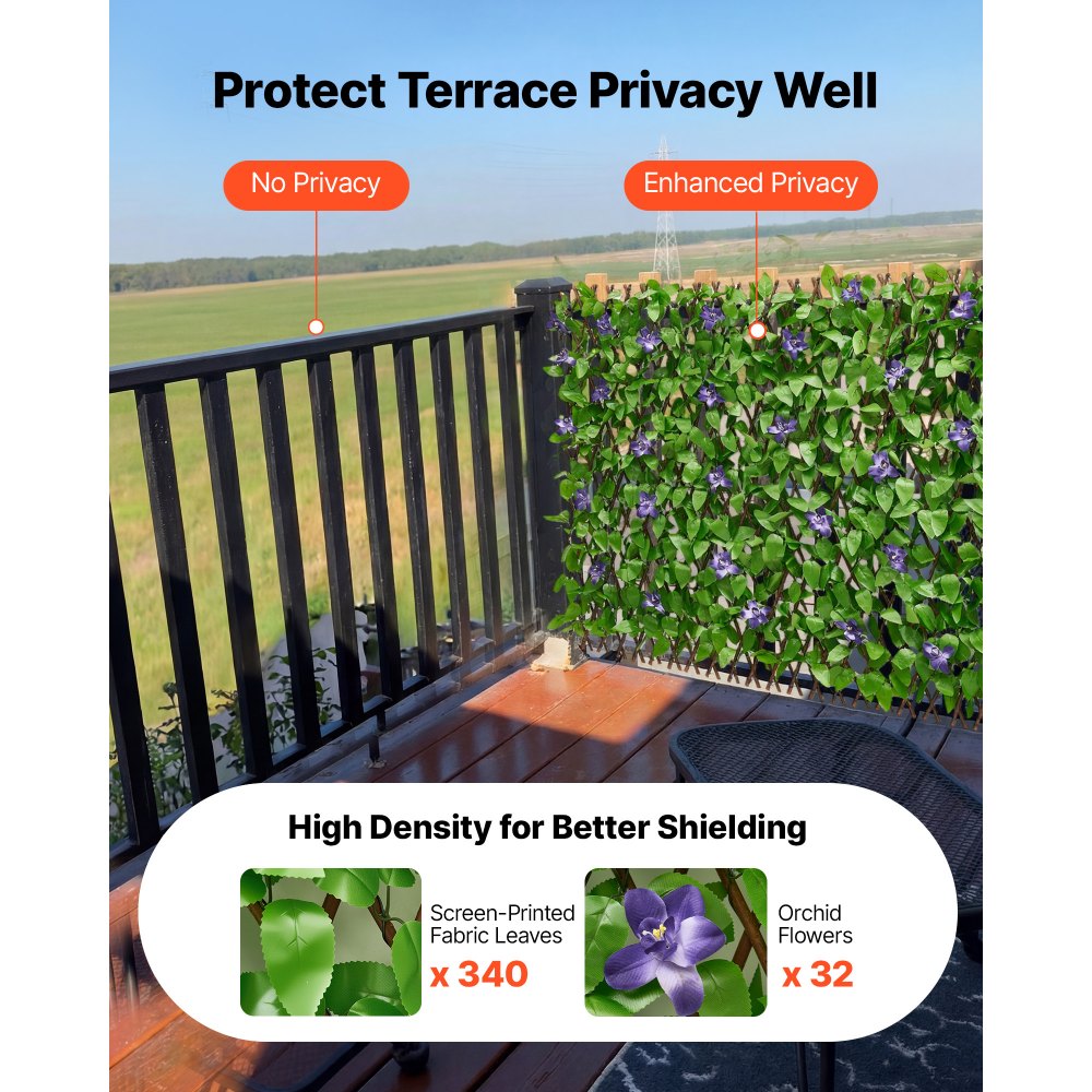 Rozkładana i składana konstrukcja: Tę ściankę roślinną można całkowicie złożyć, pozostawiając minimalne odstępy, aby zapewnić pełne pokrycie. Można ją rozłożyć, aby zapewnić sobie swobodny widok na zewnątrz, jednocześnie zachowując prywatność, ograniczając widok do sąsiadów i przechodniów.