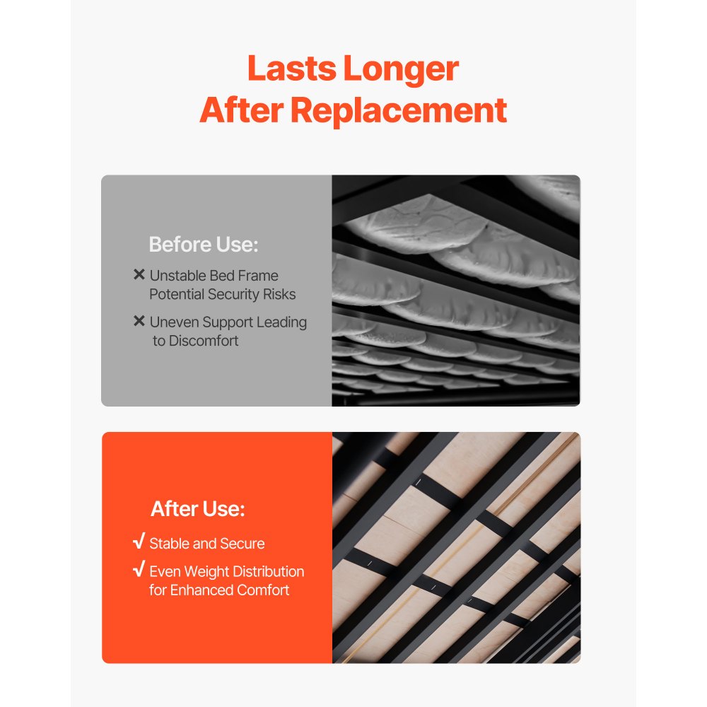 Materiał premium: Wykonany z wysokiej jakości sklejki sosnowej o grubości 10 mm (0,4 cala). Materiał ten nie pęka ani nie rozpada się. Zapewnia solidne podparcie materaca i gwarantuje komfortowy sen.
